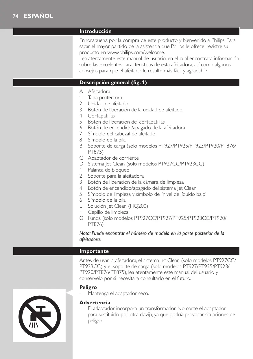 Afeitadora Tapa protectora Unidad de afeitado Botón de liberación de la unidad de afeitado Cortapatillas Botón de liberación del cortapatillas Botón de encendido/apagado de la afeitadora Símbolo del cabezal de afeitado Símbolo de la pila Soporte de carga (solo modelos PT927/PT925/PT923/PT920/PT876/ PT875) C Adaptador de corriente D Sistema Jet Clean (solo modelos PT927CC/PT923CC) 1 Palanca de bloqueo 2 Soporte para la afeitadora 3 Botón de liberación de la cámara de limpieza 4 Botón de encendido/apagado del sistema Jet Clean 5 Símbolo de limpieza y símbolo de “nivel de líquido bajo” 6 Símbolo de la pila E Solución Jet Clean (HQ200) F Cepillo de limpieza G Funda (solo modelos PT927CC/PT927/PT925/PT923CC/PT920/ PT876) Nota: Puede encontrar el número de modelo en la parte posterior de la afeitadora. Importante Antes de usar la afeitadora, el sistema Jet Clean (solo modelos PT927CC/ PT923CC) y el soporte de carga (solo modelos PT927/PT925/PT923/ PT920/PT876/PT875), lea atentamente este manual del usuario y consérvelo por si necesitara consultarlo en el futuro. Peligro -- Mantenga el adaptador seco. Advertencia -- El adaptador incorpora un transformador. No corte el adaptador para sustituirlo por otra clavija, ya que podría provocar situaciones de peligro. Español