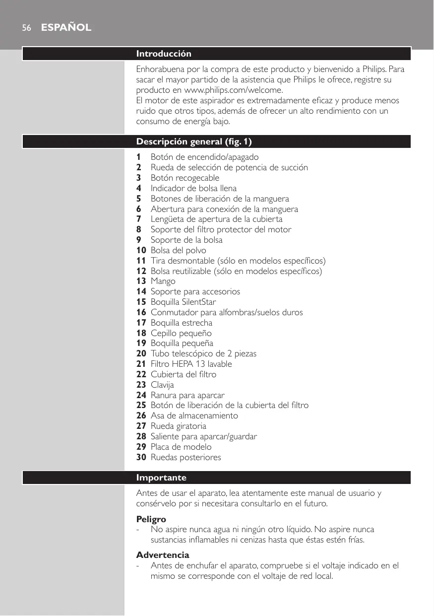 Español Introducción Enhorabuena por la compra de este producto y bienvenido a Philips. Para sacar el mayor partido de la asistencia que Philips le ofrece, registre su producto en www.philips.com/welcome. El motor de este aspirador es extremadamente eficaz y produce menos ruido que otros tipos, además de ofrecer un alto rendimiento con un consumo de energía bajo. Descripción general (fig. 1) 1 2 3 4 5 6 7 8 9 10 11 12 13 14 15 16 17 18 19 20 21 22 23 24 25 26 27 28 29 30