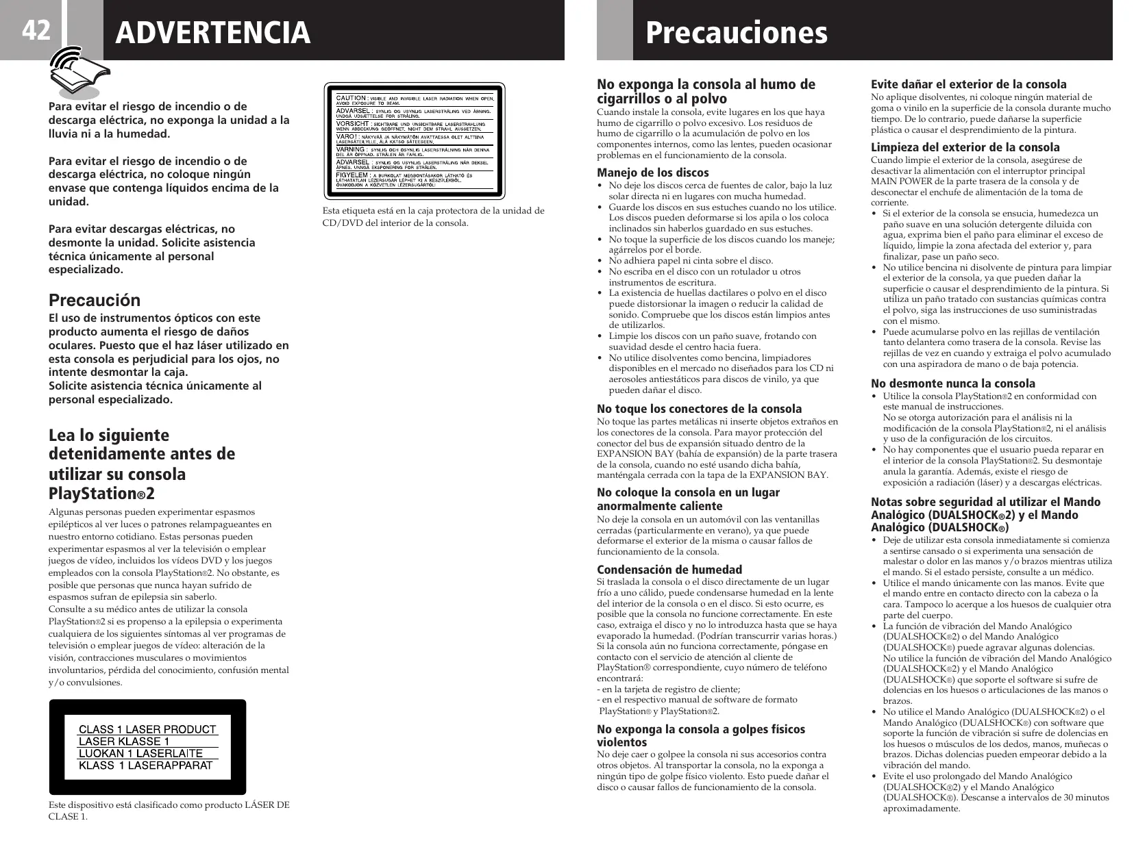 - No hay componentes que el usuario pueda reparar en el interior de la consola PlayStation®2. Su desmontaje anula la garantía. Además, existe el riesgo de exposición a radiación (láser) y a descargas eléctricas. Notas sobre seguridad al utilizar el Mando Analógico (DUALSHOCK®2) y el Mando Analógico (DUALSHOCK®)
