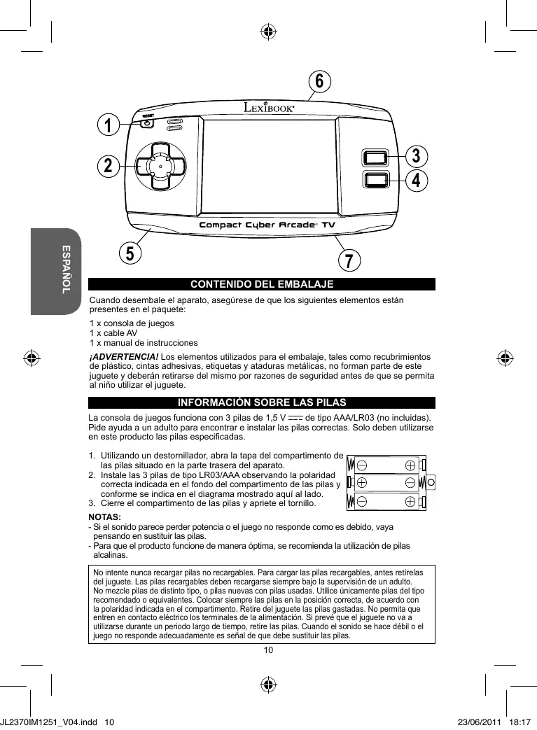 - Cuando juegue a vídeo juegos tómese de 10 a 15 minutos de descanso por cada hora de juego. NOTA: Conserve este manual de instrucciones ya que contiene informaciones de importancia. Este producto está cubierto por nuestra garantía de 2 años. Para cualquier reclamación bajo la garantía o petición de servicio post venta deberá dirigirse a su revendedor y presentar su comprobante de compra. Nuestra garantía cubre los defectos de material o montaje que sean imputables al fabricante, con la excepción de todo aquel deterioro que sea consecuencia de la no observación de las indicaciones indicadas en el manual de instrucciones o de toda intervención improcedente sobre este aparato (como por ejemplo el desmontaje, exposición al calor o a la humedad…). Se recomienda conservar el embalaje para cualquier referencia futura. En nuestro constante afán de superación, podemos proceder a la modificación de los colores y detalles del producto mostrado en el embalaje. ¡ADVERTENCIA! No apto para niños menores de 3 años. Peligro de atragantamiento – Piezas pequeñas. ESPAÑOL Para limpiar el juguete, utilice únicamente un paño suave humedecido en agua. No utilice ningún producto detergente. No exponga el juguete a la acción directa de los rayos del sol ni a ninguna otra fuente de calor. No mojar el juguete. No desmonte o deje caer el juguete. Retire las pilas del juguete si no va utilizarlo durante largos periodos de tiempo. Referencia: JL2370 Diseñado y desarrollado en Europa – Fabricado en China ©2011 LEXIBOOK® España CEFA TOYS Servicio atención al consumidor: 976144606 consumidor@cefatoys.com www.lexibook.com ¡ADVERTENCIA! La utilización excesiva de este producto con el volumen al máximo puede dañar sus oídos. Advertencia para la protección del medio ambiente ¡Los aparatos eléctricos desechados son reciclables y no deben ser eliminados en la basura doméstica! Por ello pedimos que nos ayude a contribuir activamente en el ahorro de recursos y en la protección del medio ambiente entregando este aparato en los centros de colección (si existen). JL2370IM1251_V04.indd 13