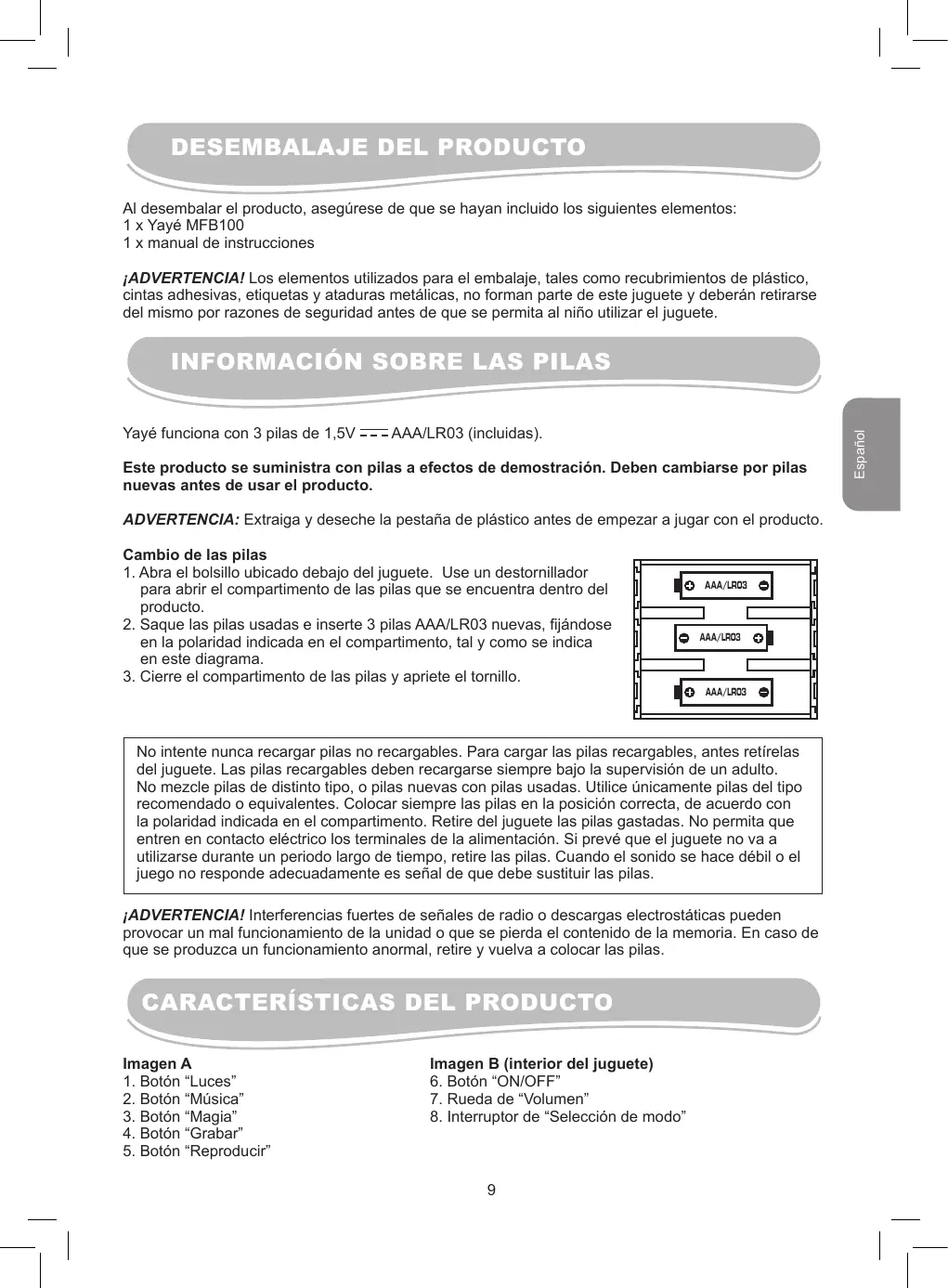 No intente nunca recargar pilas no recargables. Para carrar las pilas recargables, antes retirelas del juguete. Las pilas recargables deben recargarse siempre bajo la supervisión de unadulto. No mezcle pilas dedistinctipo, o pilas cuales con pilas usadas. Utiliceunicamente pilas del tipo recomendado o equivalentes.Colocar sempre las pilas en la posicón correcta, de acuerdo con la polaridad indicada en el compartmento.Retire del juguete las pilas gastadas.No permita queentinen contacto elctrico los terminales de la alimentacion.Si preveque que el juguete no va autilizarse durante un periodo largo de tiempo,retire las pilas.Cuongel sanido se hace debil o eljuego no responde adecadually es sealalde queDebe sustituir las pilas.