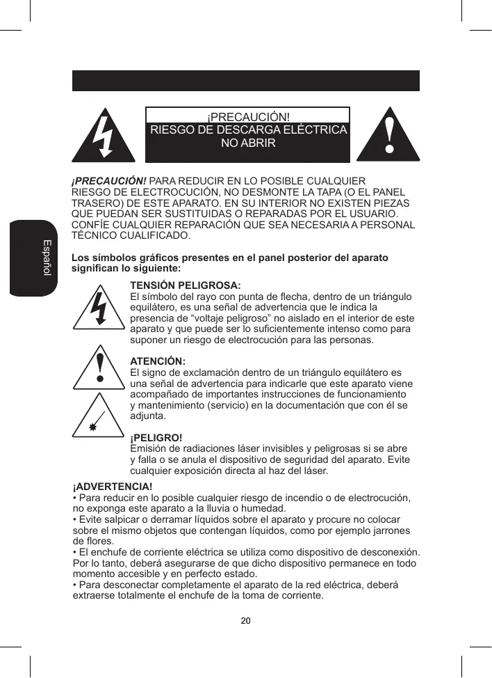 El símbolo del rayo con punta de flecha, dentro de un triángulo equilátero, es una señal de advertencia que le indica la presencia de “voltaje peligroso” no aislado en el interior de este aparato y que puede ser lo suficientemente intenso como para suponer un riesgo de electrocución para las personas. ATENCIÓN: El signo de exclamación dentro de un triángulo equilátero es una señal de advertencia para indicarle que este aparato viene acompañado de importantes instrucciones de funcionamiento y mantenimiento (servicio) en la documentación que con él se adjunta. ¡PELIGRO! Emisión de radiaciones láser invisibles y peligrosas si se abre y falla o se anula el dispositivo de seguridad del aparato. Evite cualquier exposición directa al haz del láser.