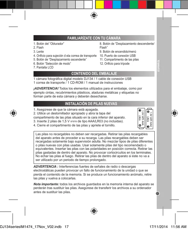 1. Asegúrese de que la cámara está apagada. 2. Utilice un destornillador apropiado y abra la tapa del compartimento de las pilas situado en la cara inferior del aparato. 3. Inserte 2 pilas de 1,5 V de tipo AAA/LR03 (no incluidas). 4. Cierre el compartimento de las pilas y apriete el tornillo. Las pilas no recargables no deben ser recargadas. Retirar las pilas recargables del aparato antes de proceder a su recarga. Las pilas recargables deben ser recargadas solamente bajo supervisión adulta. No mezclar tipos de pilas diferentes o pilas nuevas con pilas usadas. Usar solamente pilas del tipo recomendado o equivalentes. Insertar las pilas con las polaridades en posición correcta. Retirar las pilas gastadas de dentro del aparato. No provocar cortocircuitos en los terminales. No echar las pilas al fuego. Retirar las pilas de dentro del aparato si éste no va a ser utilizado por un periodo de tiempo prolongado. ADVERTENCIA : Interferencias fuertes de señales de radio o descargas electrostáticas pueden provocar un fallo de funcionamiento de la unidad o que se pierda el contenido de la memoria. Si se produce un funcionamiento anómalo, retire las pilas y vuelva a colocarlas. Nota importante: todos los archivos guardados en la memoria interna del aparato se perderán tras sustituir las pilas. Asegúrese de transferir los archivos a su ordenador antes de sustituir las pilas.