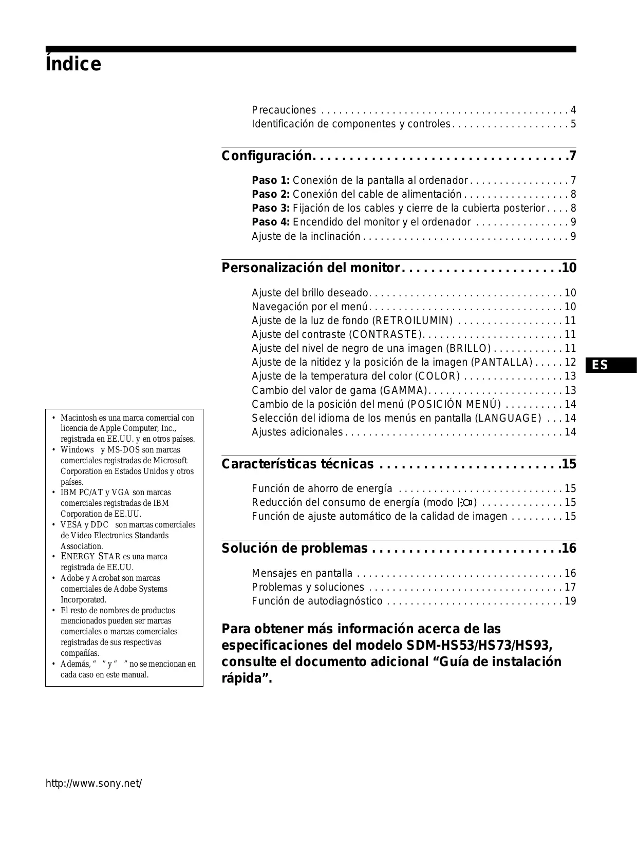 • Windows y MS-DOS son marcas comerciales registradas de Microsoft Corporation en Estados Unidos y otros países. • IBM PC/AT y VGA son marcas comerciales registradas de IBM Corporation de EE.UU. • VESA y DDC son marcas comerciales de Video Electronics Standards Association. • ENERGY STAR es una marca registrada de EE.UU. • Adobe y Acrobat son marcas comerciales de Adobe Systems Incorporated. • El resto de nombres de productos mencionados pueden ser marcas comerciales o marcas comerciales registradas de sus respectivas compañías. • Además, “” y “” no se mencionan en cada caso en este manual.