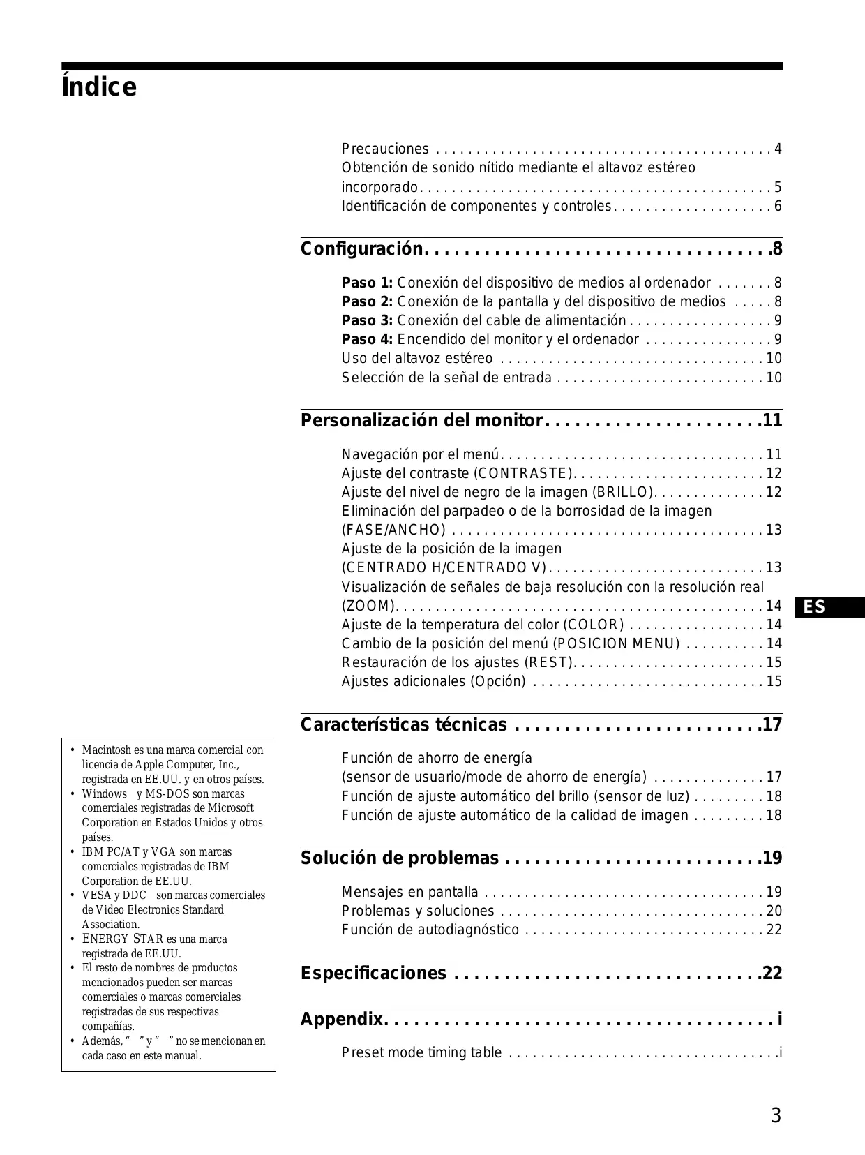 • Macintosh es una marca comercial con licencia de Apple Computer, Inc., registrada en EE.UU. y en otros países. • Windows y MS-DOS son marcas comerciales registradas de Microsoft Corporation en Estados Unidos y otros países. • IBM PC/AT y VGA son marcas comerciales registradas de IBM Corporation de EE.UU. • VESA y DDC son marcas comerciales de Video Electronics Standard Association. • ENERGY STAR es una marca registrada de EE.UU. • El resto de nombres de productos mencionados pueden ser marcas comerciales o marcas comerciales registradas de sus respectivas compañías. • Además, “” y “” no se mencionan en cada caso en este manual.