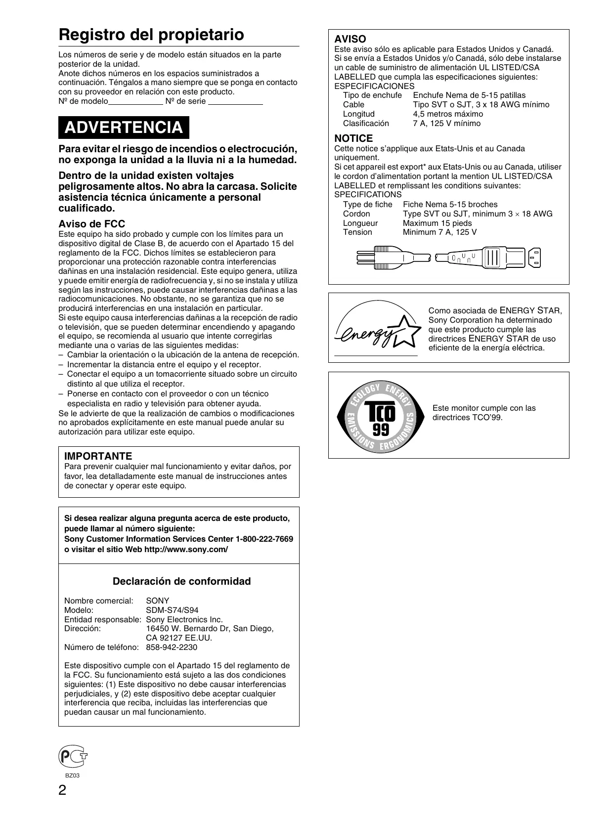 • Nombre del modelo: SDM-S74 o SDM-S94 • Número de serie • Descripción detallada del problema • Fecha de compra • Nombre y especificaciones del ordenador y la tarjeta gráfica • Tipo de señales de entrada (RVA analógico/RVA digital)