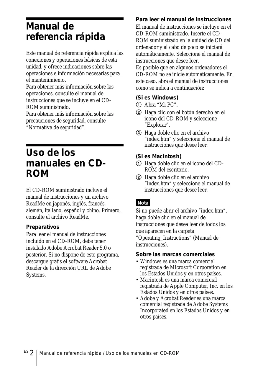 Para leer el manual de instrucciones El manual de instrucciones se incluye en el CD-ROM suministrado. Inserte el CDROM suministrado en la unidad de CD del ordenador y al cabo de poco se iniciará automáticamente. Seleccione el manual de instrucciones que desee leer. Es posible que en algunos ordenadores el CD-ROM no se inicie automáticamente. En este caso, abra el manual de instrucciones como se indica a continuación: (Si es Windows) 1 Abra “Mi PC”. 2 Haga clic con el botón derecho en el icono del CD-ROM y seleccione “Explorar”. 3 Haga doble clic en el archivo “index.htm” y seleccione el manual de instrucciones que desee leer. (Si es Macintosh) 1 Haga doble clic en el icono del CDROM del escritorio. 2 Haga doble clic en el archivo “index.htm” y seleccione el manual de instrucciones que desee leer. Nota Si no puede abrir el archivo “index.htm”, haga doble clic en el manual de instrucciones que desea leer de todos los que aparecen en la carpeta “Operating_Instructions” (Manual de instrucciones). Sobre las marcas comerciales