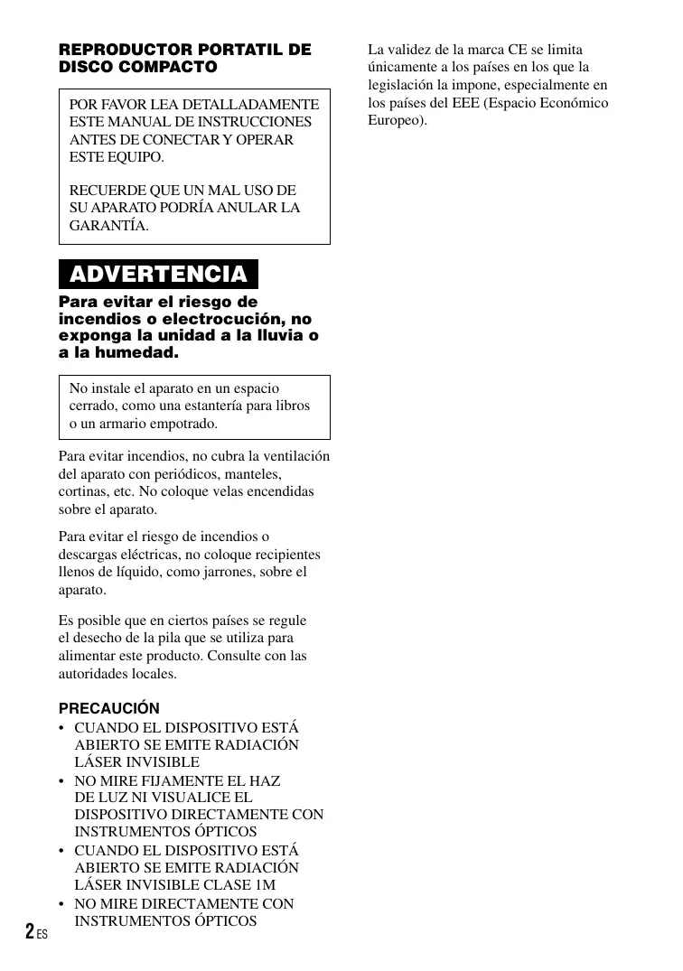 Sobre seguridad • Si se introduce algún objeto sólido o líquido en el reproductor de CD, desenchúfelo y haga que sea revisado por personal especializado antes de volver a utilizarlo. • No coloque objetos extraños en la toma DC IN 3 V (entrada de alimentación externa).