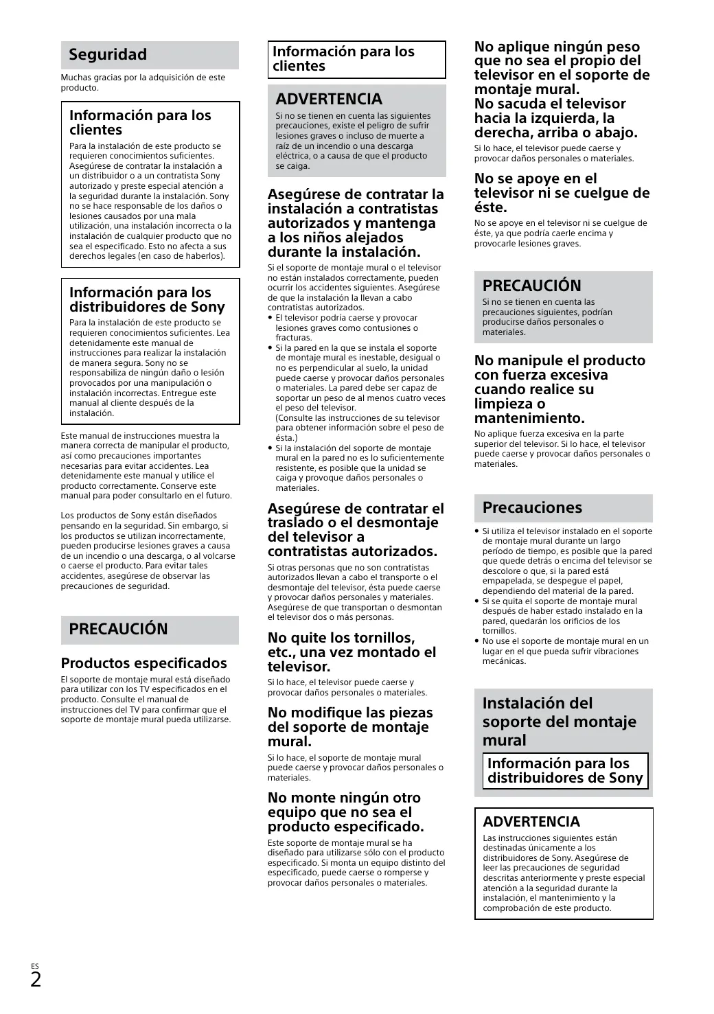 Para la instalación de este producto se requieren conocimientos suficientes. Lea detenidamente este manual de instrucciones para realizar la instalación de manera segura. Sony no se responsabiliza de ningún daño o lesión provocados por una manipulación o instalación incorrectas. Entregue este manual al cliente después de la instalación. Este manual de instrucciones muestra la manera correcta de manipular el producto, así como precauciones importantes necesarias para evitar accidentes. Lea detenidamente este manual y utilice el producto correctamente. Conserve este manual para poder consultarlo en el futuro. Los productos de Sony están diseñados pensando en la seguridad. Sin embargo, si los productos se utilizan incorrectamente, pueden producirse lesiones graves a causa de un incendio o una descarga, o al volcarse o caerse el producto. Para evitar tales accidentes, asegúrese de observar las precauciones de seguridad.