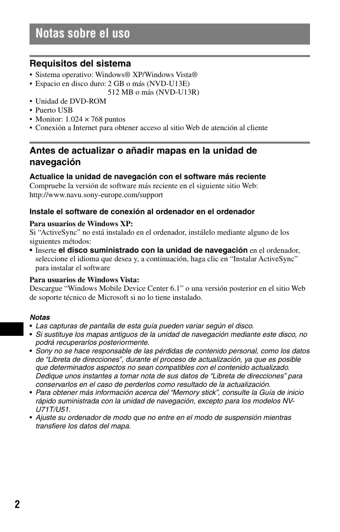 - Conexión a Internet para obtener acceso al sitio Web de atención al cliente Antes de actualizar o añadir mapas en la unidad de navegación Actualice la unidad de navegación con el software más reciente Compruebe la versión de software más reciente en el siguiente sitio Web: http://www.navu.sony-europe.com/support Instale el software de conexión al ordenador en el ordenador Para usuarios de Windows XP: Si “ActiveSync” no está instalado en el ordenador, instálelo mediante alguno de los siguientes métodos: