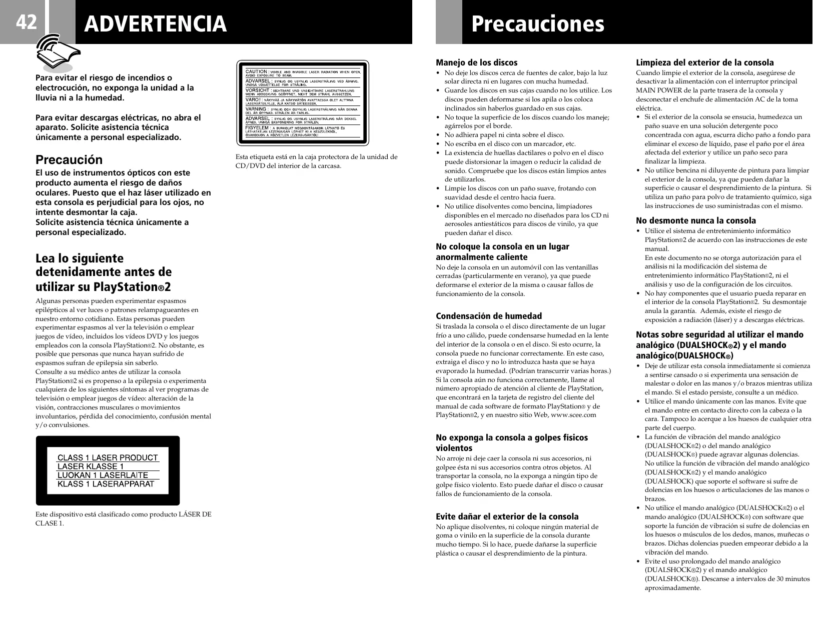 - No utilice bencina ni diluyente de pintura para limpiar el exterior de la consola, ya que pueden dañar la superficie o causar el desprendimiento de la pintura. Si utiliza un paño para polvo de tratamiento químico, siga las instrucciones de uso suministradas con el mismo. No coloque la consola en un lugar anormalmente caliente No deje la consola en un automóvil con las ventanillas cerradas (particularmente en verano), ya que puede deformarse el exterior de la misma o causar fallos de funcionamiento de la consola. Condensación de humedad Si traslada la consola o el disco directamente de un lugar frío a uno cálido, puede condensarse humedad en la lente del interior de la consola o en el disco. Si esto ocurre, la consola puede no funcionar correctamente. En este caso, extraiga el disco y no lo introduzca hasta que se haya evaporado la humedad. (Podrían transcurrir varias horas.) Si la consola aún no funciona correctamente, llame al número apropiado de atención al cliente de PlayStation, que encontrará en la tarjeta de registro del cliente del manual de cada software de formato PlayStation® y de PlayStation®2, y en nuestro sitio Web, www.scee.com No exponga la consola a golpes físicos violentos No arroje ni deje caer la consola ni sus accesorios, ni golpee ésta ni sus accesorios contra otros objetos. Al transportar la consola, no la exponga a ningún tipo de golpe físico violento. Esto puede dañar el disco o causar fallos de funcionamiento de la consola. Este dispositivo está clasificado como producto LÁSER DE CLASE 1. Evite dañar el exterior de la consola No aplique disolventes, ni coloque ningún material de goma o vinilo en la superficie de la consola durante mucho tiempo. Si lo hace, puede dañarse la superficie plástica o causar el desprendimiento de la pintura. No desmonte nunca la consola
