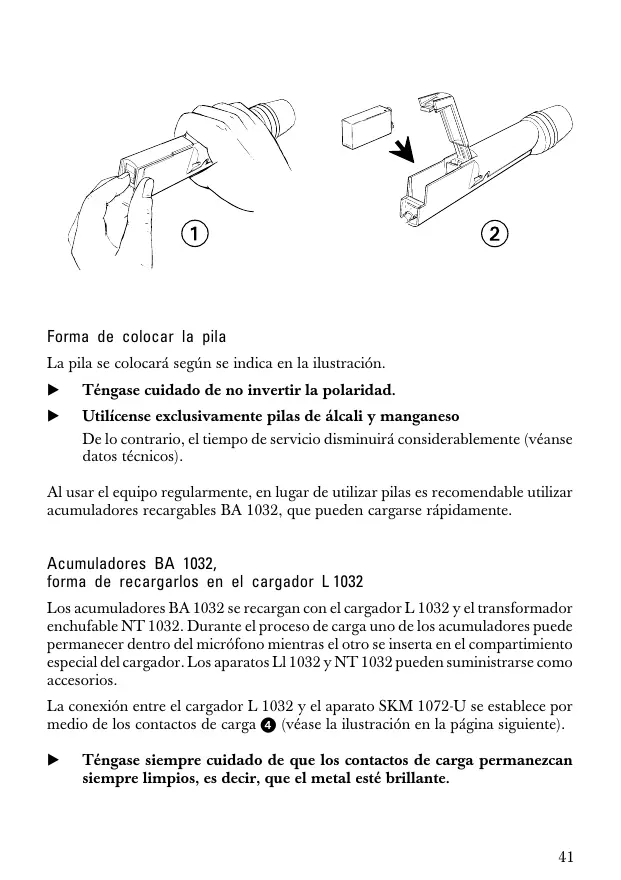 Utilícense exclusivamente pilas de álcali y manganeso De lo contrario, el tiempo de servicio disminuirá considerablemente (véanse datos técnicos). Al usar el equipo regularmente, en lugar de utilizar pilas es recomendable utilizar acumuladores recargables BA 1032, que pueden cargarse rápidamente. Acumuladores BA 1032, forma de recargarlos en el cargador L 1032 Los acumuladores BA 1032 se recargan con el cargador L 1032 y el transformador enchufable NT 1032. Durante el proceso de carga uno de los acumuladores puede permanecer dentro del micrófono mientras el otro se inserta en el compartimiento especial del cargador. Los aparatos Ll 1032 y NT 1032 pueden suministrarse como accesorios. La conexión entre el cargador L 1032 y el aparato SKM 1072-U se establece por medio de los contactos de carga (véase la ilustración en la página siguiente).