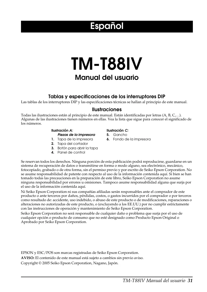 TM-T88IV Manual do utilizador 25 English 26 TM-T88IV Manual do utilizador English TM-T88IV Manual do utilizador 27 English 28 TM-T88IV Manual do utilizador English TM-T88IV Manual do utilizador 29 English 30 TM-T88IV Manual do utilizador English Español TM-T88IV Manual del usuario Tablas y especificaciones de los interruptores DIP Las tablas de los interruptores DIP y las especificaciones técnicas se hallan al principio de este manual. Ilustraciones Todas las ilustraciones están al principio de este manual. Están identificadas por letras (A, B, C,…). Algunas de las ilustraciones tienen números en ellas. Vea la lista que sigue para conocer el significado de los números. Ilustración A: Piezas de la impresora