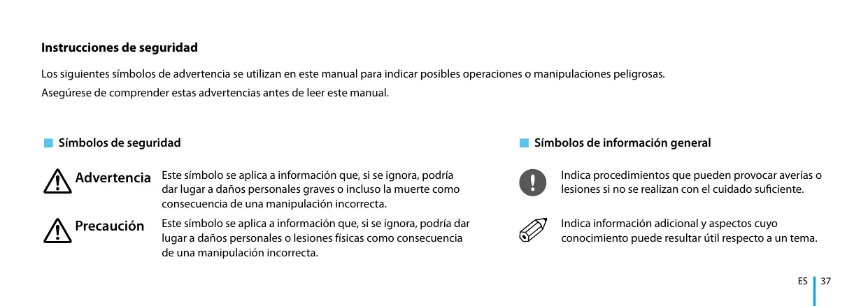 - Consejos de visualización Instrucciones de seguridad Los siguientes símbolos de advertencia se utilizan en este manual para indicar posibles operaciones o manipulaciones peligrosas. Asegúrese de comprender estas advertencias antes de leer este manual. f Símbolos de seguridad f Símbolos de información general Advertencia Este símbolo se aplica a información que, si se ignora, podría dar lugar a daños personales graves o incluso la muerte como consecuencia de una manipulación incorrecta. Indica procedimientos que pueden provocar averías o lesiones si no se realizan con el cuidado suficiente. Precaución Este símbolo se aplica a información que, si se ignora, podría dar lugar a daños personales o lesiones físicas como consecuencia de una manipulación incorrecta. Indica información adicional y aspectos cuyo conocimiento puede resultar útil respecto a un tema. p. 46