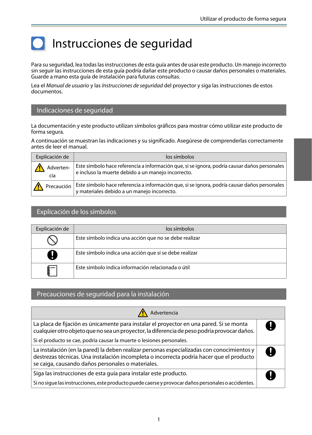 Este símbolo indica información relacionada o útil Precauciones de seguridad para la instalación Advertencia La placa de fijación es únicamente para instalar el proyector en una pared. Si se monta cualquier otro objeto que no sea un proyector, la diferencia de peso podría provocar daños. Si el producto se cae, podría causar la muerte o lesiones personales. La instalación (en la pared) la deben realizar personas especializadas con conocimientos y destrezas técnicas. Una instalación incompleta o incorrecta podría hacer que el producto se caiga, causando daños personales o materiales. Siga las instrucciones de esta guía para instalar este producto. Si no sigue las instrucciones, este producto puede caerse y provocar daños personales o accidentes.