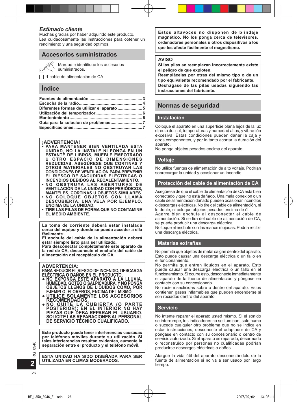 - Las emisoras presintonizadas registradas ( página 5) se perderán si las pilas se retiran durante más de 3 minutos. Vuelva a registrar las emisoras cuando utilice la radio la próxima vez. RF_U350_8946_E.indb