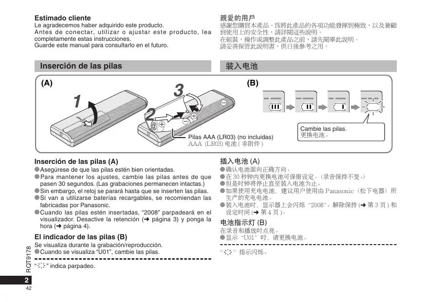 Le agradecemos haber adquirido este producto. Antes de conectar, utilizar o ajustar este producto, lea completamente estas instrucciones. Guarde este manual para consultarlo en el futuro. Inserción de las pilas