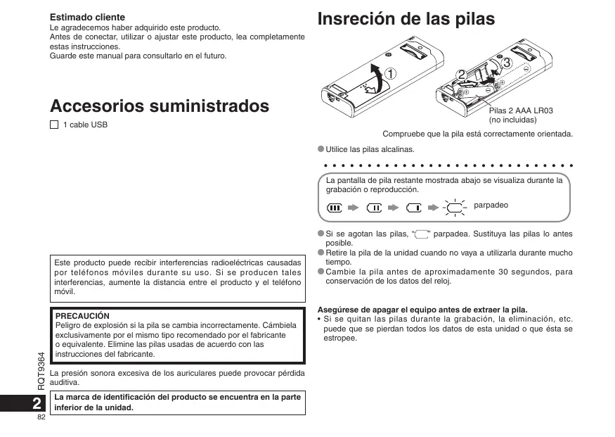 - Utilice las pilas alcalinas. La pantalla de pila restante mostrada abajo se visualiza durante la grabación o reproducción. parpadeo RQT9364 Este producto puede recibir interferencias radioeléctricas causadas por teléfonos móviles durante su uso. Si se producen tales interferencias, aumente la distancia entre el producto y el teléfono móvil.