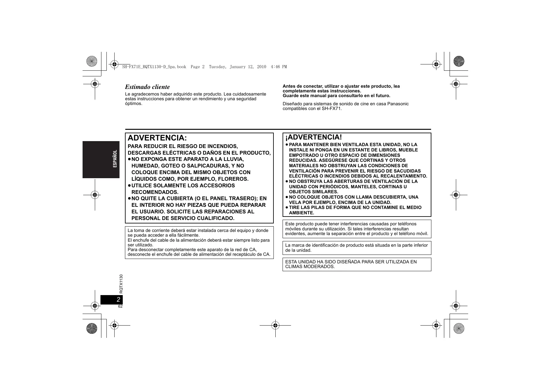 PERSONAL DE SERVICIO CUALIFICADO. La toma de corriente deberá estar instalada cerca del equipo y donde se pueda acceder a ella fácilmente. El enchufe del cable de la alimentación deberá estar siempre listo para ser utilizado. Para desconectar completamente este aparato de la red de CA, desconecte el enchufe del cable de alimentación del receptáculo de CA. Antes de conectar, utilizar o ajustar este producto, lea completamente estas instrucciones. Guarde este manual para consultarlo en el futuro. Diseñado para sistemas de sonido de cine en casa Panasonic compatibles con el SH-FX71. ¡ADVERTENCIA! ≥ PARA MANTENER BIEN VENTILADA ESTA UNIDAD, NO LA INSTALE NI PONGA EN UN ESTANTE DE LIBROS, MUEBLE