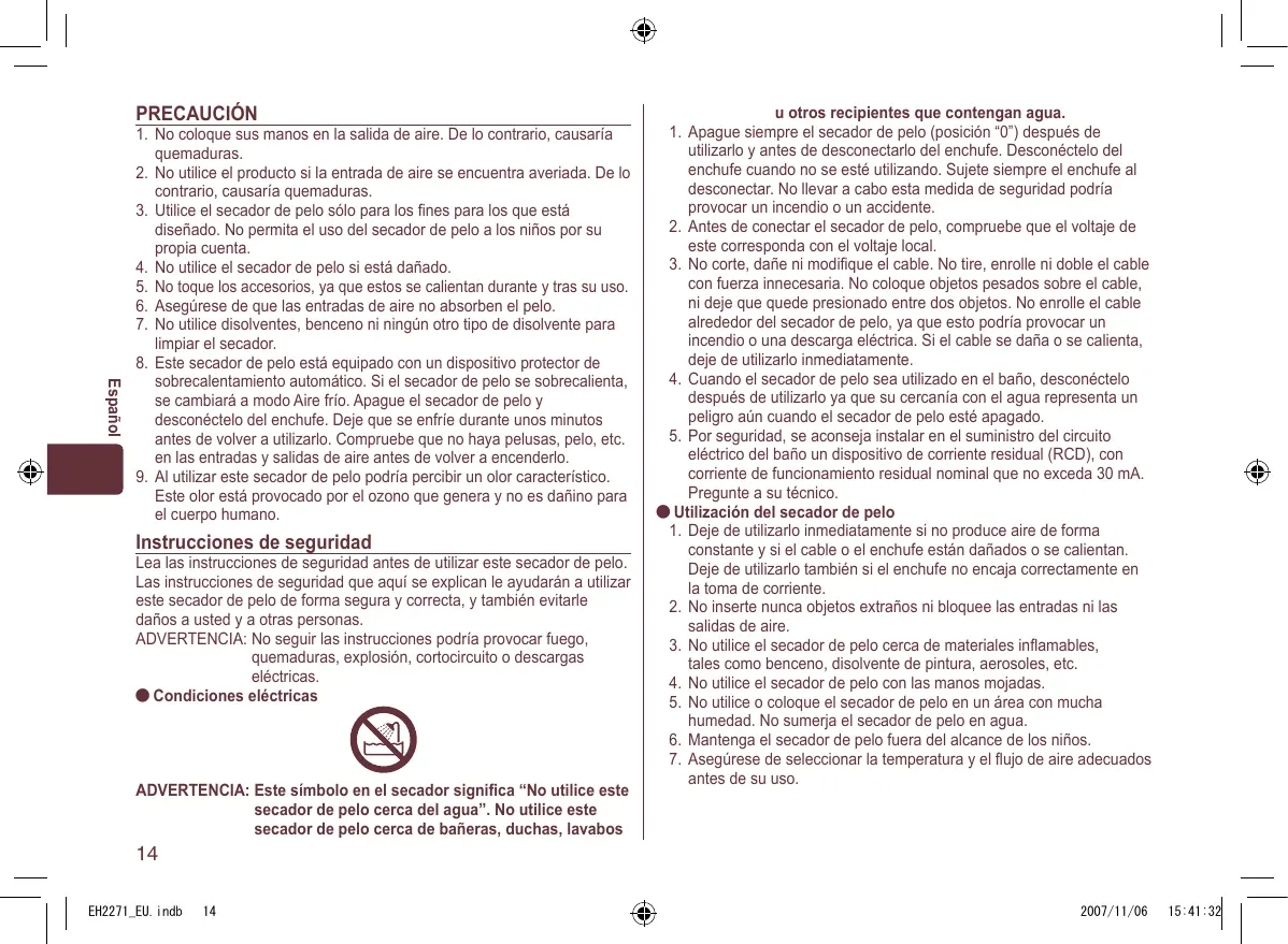 Este olor está provocado por el ozono que genera y no es dañino para el cuerpo humano. Instrucciones de seguridad Lea las instrucciones de seguridad antes de utilizar este secador de pelo. Las instrucciones de seguridad que aquí se explican le ayudarán a utilizar este secador de pelo de forma segura y correcta, y también evitarle daños a usted y a otras personas. ADVERTENCIA: No seguir las instrucciones podría provocar fuego, quemaduras, explosión, cortocircuito o descargas eléctricas. Condiciones eléctricas ADVERTENCIA: E ste símbolo en el secador significa “No utilice este secador de pelo cerca del agua”. No utilice este secador de pelo cerca de bañeras, duchas, lavabos u otros recipientes que contengan agua.