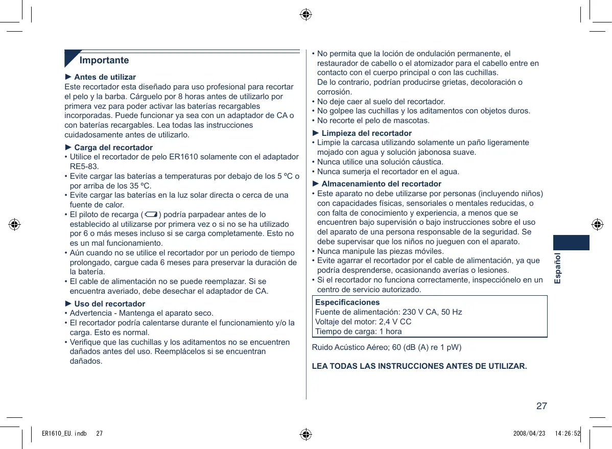 Este recortador esta diseñado para uso profesional para recortar elleo y la barba. Cárguelo por 8 horas antes de utilizespo por primera vez para poder activar las baterías recargables incorpuras. Puede configurar ya sea con un adaptordo de CA o con baterías recargables. Lea todas las instrucciones cuidadosamente antes de utilizesdo.