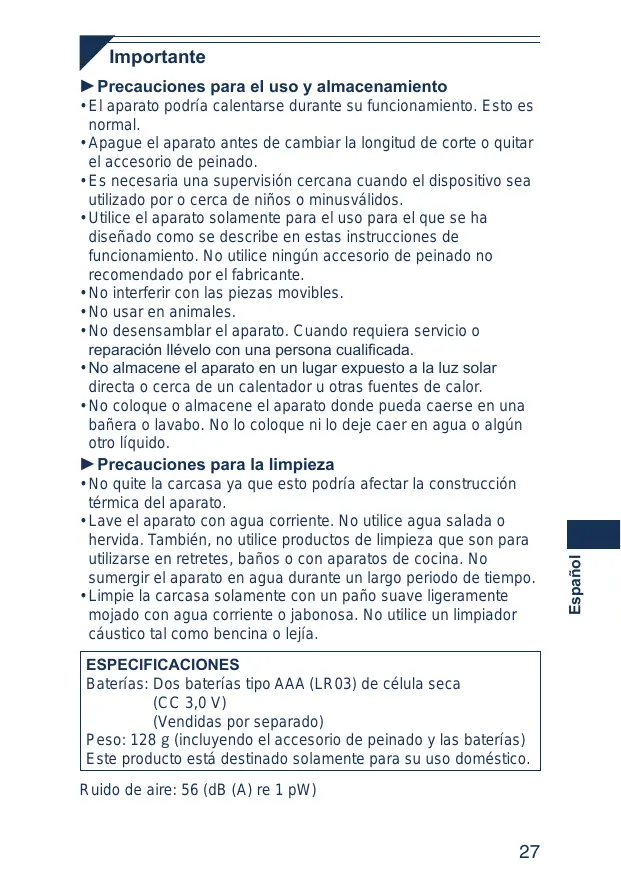 - Limpie la carcasa solamente con un paño suave ligeramente mojado con agua corriente o jabonosa. No utilice un limpiador cáustico tal como bencina o lejía. ESPECIFICACIONES Baterías: Dos baterías tipo AAA (LR03) de célula seca (CC 3,0 V) (Vendidas por separado) Peso: 128 g (incluyendo el accesorio de peinado y las baterías) Este producto está destinado solamente para su uso doméstico. Ruido de aire: 56 (dB (A) re 1 pW)