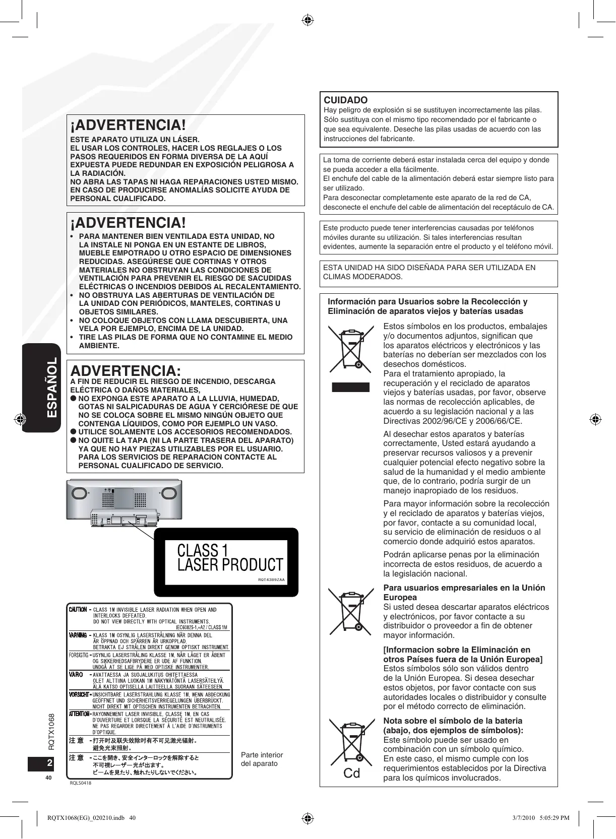 - NO QUITE LA TAPA (NI LA PARTE TRASERA DEL APARATO) YA QUE NO HAY PIEZAS UTILIZABLES POR EL USUARIO. PARA LOS SERVICIOS DE REPARACION CONTACTE AL PERSONAL CUALIFICADO DE SERVICIO. AUX Hay peligro de explosión si se sustituyen incorrectamente las pilas. Sólo sustituya con el mismo tipo recomendado por el fabricante o que sea equivalente. Deseche las pilas usadas de acuerdo con las instrucciones del fabricante. La toma de corriente deberá estar instalada cerca del equipo y donde se pueda acceder a ella fácilmente. El enchufe del cable de la alimentación deberá estar siempre listo para ser utilizado. Para desconectar completamente este aparato de la red de CA, desconecte el enchufe del cable de alimentación del receptáculo de CA. Este producto puede tener interferencias causadas por teléfonos móviles durante su utilización. Si tales interferencias resultan evidentes, aumente la separación entre el producto y el teléfono móvil. ESTA UNIDAD HA SIDO DISEÑADA PARA SER UTILIZADA EN CLIMAS MODERADOS. Información para Usuarios sobre la Recolección y Eliminación de aparatos viejos y baterías usadas Estos símbolos en los productos, embalajes y/o documentos adjuntos, significan que los aparatos eléctricos y electrónicos y las baterías no deberían ser mezclados con los desechos domésticos. Para el tratamiento apropiado, la recuperación y el reciclado de aparatos viejos y baterías usadas, por favor, observe las normas de recolección aplicables, de acuerdo a su legislación nacional y a las Directivas 2002/96/CE y 2006/66/CE. Al desechar estos aparatos y baterías correctamente, Usted estará ayudando a preservar recursos valiosos y a prevenir cualquier potencial efecto negativo sobre la salud de la humanidad y el medio ambiente que, de lo contrario, podría surgir de un manejo inapropiado de los residuos. Para mayor información sobre la recolección y el reciclado de aparatos y baterías viejos, por favor, contacte a su comunidad local, su servicio de eliminación de residuos o al comercio donde adquirió estos aparatos. RQT4389ZAA Podrán aplicarse penas por la eliminación incorrecta de estos residuos, de acuerdo a la legislación nacional. Para usuarios empresariales en la Unión Europea Si usted desea descartar aparatos eléctricos y electrónicos, por favor contacte a su distribuidor o proveedor a fin de obtener mayor información. RQTX1068 [Informacion sobre la Eliminación en otros Países fuera de la Unión Europea] Estos símbolos sólo son válidos dentro de la Unión Europea. Si desea desechar estos objetos, por favor contacte con sus autoridades locales o distribuidor y consulte por el método correcto de eliminación. Nota sobre el símbolo de la bateria (abajo, dos ejemplos de símbolos): Este símbolo puede ser usado en combinación con un símbolo químico. En este caso, el mismo cumple con los requerimientos establecidos por la Directiva para los químicos involucrados. 3/7/2010 5:05:29 PM Índice