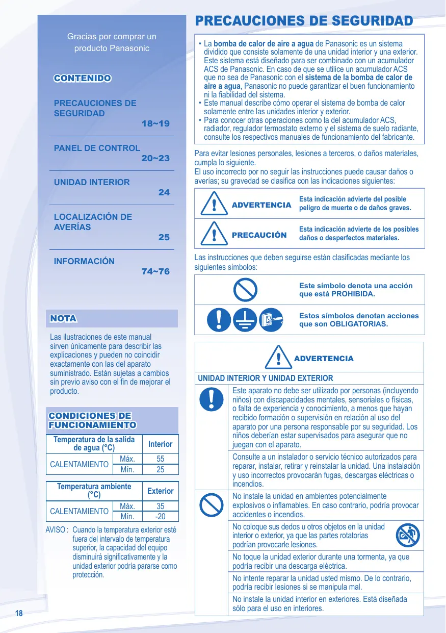 Este sistema está diseñado para ser combinado con un acumulador ACS de Panasonic. En caso de que se utilice un acumulador ACS que no sea de Panasonic con el sistema de la bomba de calor de aire a agua, Panasonic no puede garantizar el buen funcionamiento ni la fiabilidad del sistema. • Este manual describe cómo operar el sistema de bomba de calor solamente entre las unidades interior y exterior. • Para conocer otras operaciones como la del acumulador ACS, radiador, regulador termostato externo y el sistema de suelo radiante, consulte los respectivos manuales de funcionamiento del fabricante. Para evitar lesiones personales, lesiones a terceros, o daños materiales, cumpla lo siguiente. El uso incorrecto por no seguir las instrucciones puede causar daños o averías; su gravedad se clasifica con las indicaciones siguientes: