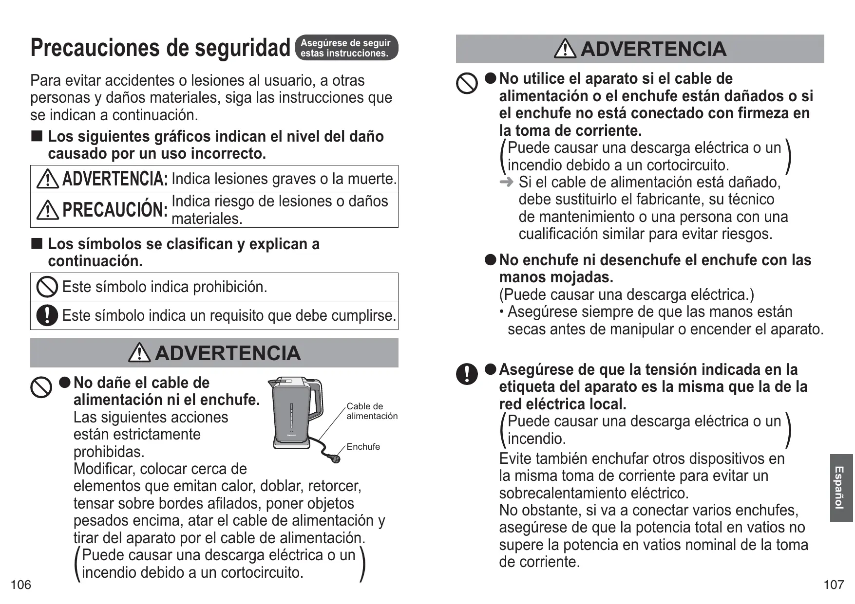 Puede producirse humo, un incendio, una descarga eléctrica o quemaduras. por ejemplo, en caso de funcionamiento inusual o avería ● El enchufe y el cable de alimentación están inusualmente calientes. ● El cable de alimentación está dañado o hay un corte del suministro eléctrico. ● El cuerpo principal está deformado, tiene daños visibles o está anormalmente caliente. ● El cuerpo tiene fugas de agua. ● El vapor continúa durante más de 3 minutos. ● Hay otra anomalía o fallo. Desenchufe el aparato inmediatamente y póngase en contacto con el vendedor o con un servicio técnico de Panasonic para una revisión o reparación. 112