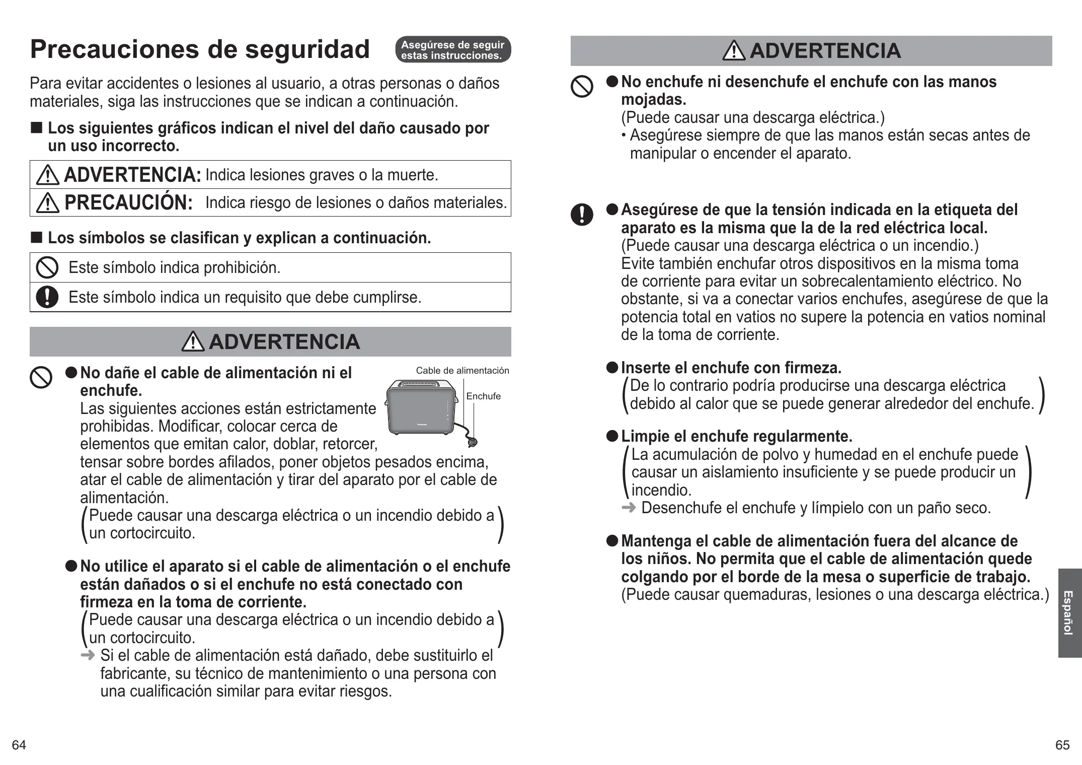- Conserve estas instrucciones de funcionamiento para su uso en el futuro. Español Veiligheidsmaatregelen Italiano Inhoud Français Inserire saldamente la spina. Precauciones de seguridad Asegúrese de seguir estas instrucciones. Para evitar accidentes o lesiones al usuario, a otras personas o daños materiales, siga las instrucciones que se indican a continuación. Los siguientes gráficos indican el nivel del daño causado por un uso incorrecto. ADVERTENCIA: Indica lesiones graves o la muerte. PRECAUCIÓN: Indica riesgo de lesiones o daños materiales. Este símbolo indica prohibición. Este símbolo indica un requisito que debe cumplirse. ADVERTENCIA Cable de alimentación enchufe. Enchufe Las siguientes acciones están estrictamente prohibidas. Modificar, colocar cerca de elementos que emitan calor, doblar, retorcer, tensar sobre bordes afilados, poner objetos pesados encima, atar el cable de alimentación y tirar del aparato por el cable de alimentación. Puede causar una descarga eléctrica o un incendio debido a un cortocircuito.