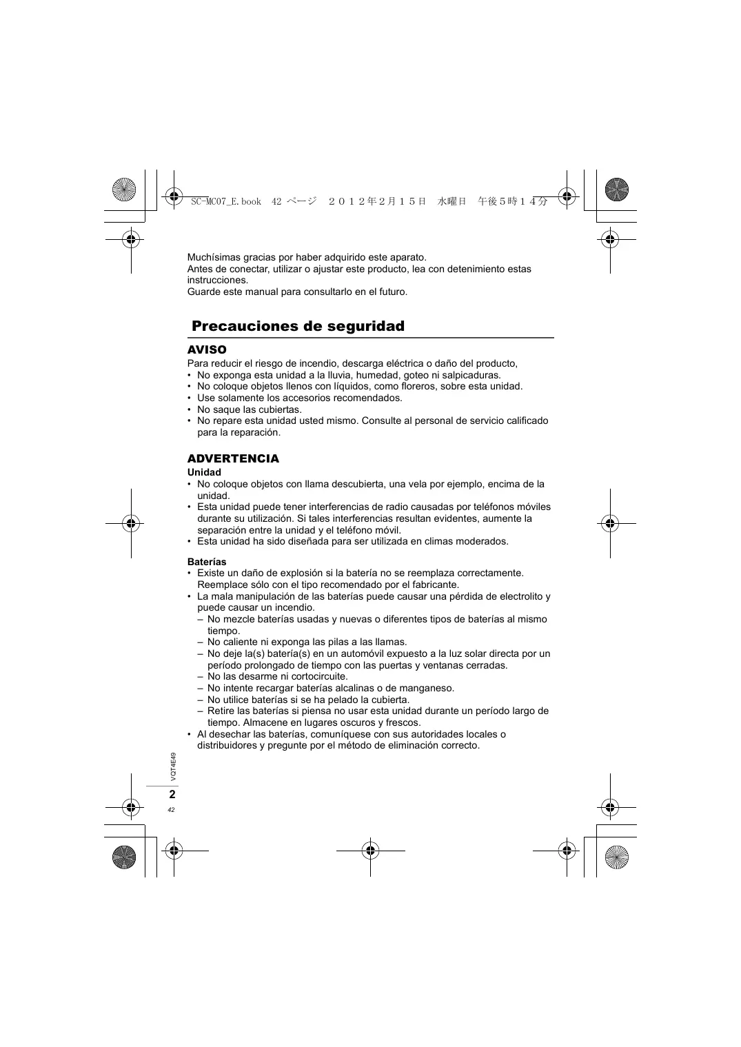 - USB es de mayor prioridad que la batería, cuando esta unidad está conectada a un PC y la batería está insertada a mismo tiempo. SC-MC07_E.book 45 ページ 2012年2月15日