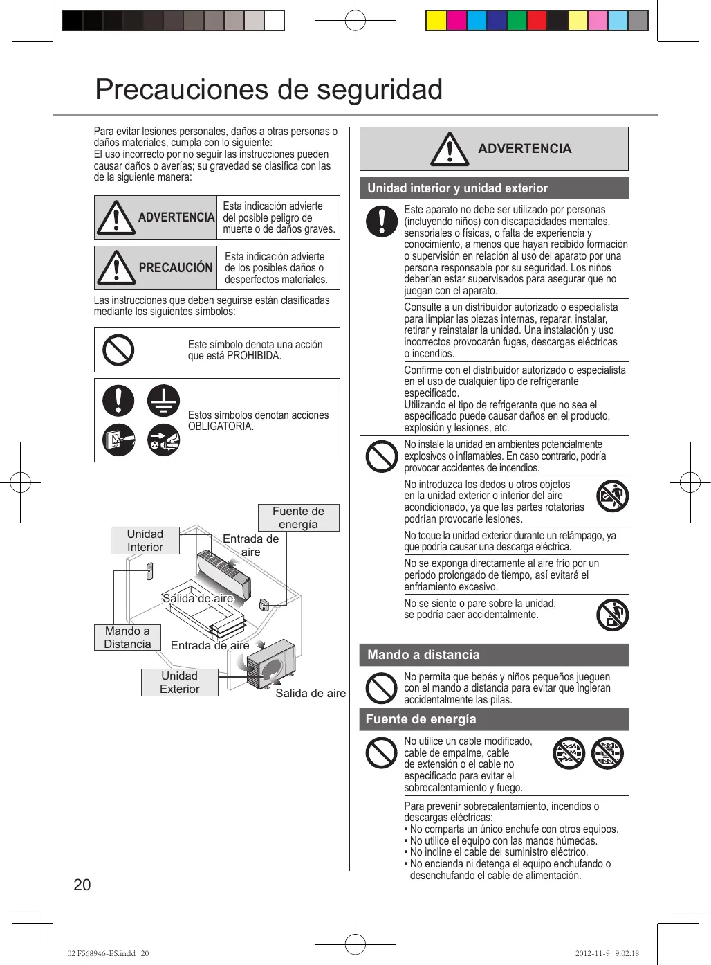 - Información Accesorios Español Precauciones de seguridad Para evitar lesiones personales, daños a otras personas o daños materiales, cumpla con lo siguiente: El uso incorrecto por no seguir las instrucciones pueden causar daños o averías; su gravedad se clasifica con las de la siguiente manera: Esta indicación advierte ADVERTENCIA del posible peligro de muerte o de daños graves. Esta indicación advierte PRECAUCIÓN de los posibles daños o desperfectos materiales. Las instrucciones que deben seguirse están clasificadas mediante los siguientes símbolos: Este símbolo denota una acción que está PROHIBIDA. Estos símbolos denotan acciones OBLIGATORIA. Fuente de energía Entrada de aire Unidad Interior Salida de aire Mando a Distancia Entrada de aire Unidad Exterior ADVERTENCIA Unidad interior y unidad exterior Este aparato no debe ser utilizado por personas (incluyendo niños) con discapacidades mentales, sensoriales o físicas, o falta de experiencia y conocimiento, a menos que hayan recibido formación o supervisión en relación al uso del aparato por una persona responsable por su seguridad. Los niños deberían estar supervisados para asegurar que no juegan con el aparato. Consulte a un distribuidor autorizado o especialista para limpiar las piezas internas, reparar, instalar, retirar y reinstalar la unidad. Una instalación y uso incorrectos provocarán fugas, descargas eléctricas o incendios. Confirme con el distribuidor autorizado o especialista en el uso de cualquier tipo de refrigerante especificado. Utilizando el tipo de refrigerante que no sea el especificado puede causar daños en el producto, explosión y lesiones, etc. No instale la unidad en ambientes potencialmente explosivos o inflamables. En caso contrario, podría provocar accidentes de incendios. No introduzca los dedos u otros objetos en la unidad exterior o interior del aire acondicionado, ya que las partes rotatorias podrían provocarle lesiones. No toque la unidad exterior durante un relámpago, ya que podría causar una descarga eléctrica. No se exponga directamente al aire frío por un periodo prolongado de tiempo, así evitará el enfriamiento excesivo. No se siente o pare sobre la unidad, se podría caer accidentalmente. Mando a distancia Salida de aire No permita que bebés y niños pequeños jueguen con el mando a distancia para evitar que ingieran accidentalmente las pilas. Fuente de energía No utilice un cable modificado, cable de empalme, cable de extensión o el cable no especificado para evitar el sobrecalentamiento y fuego. p. 55