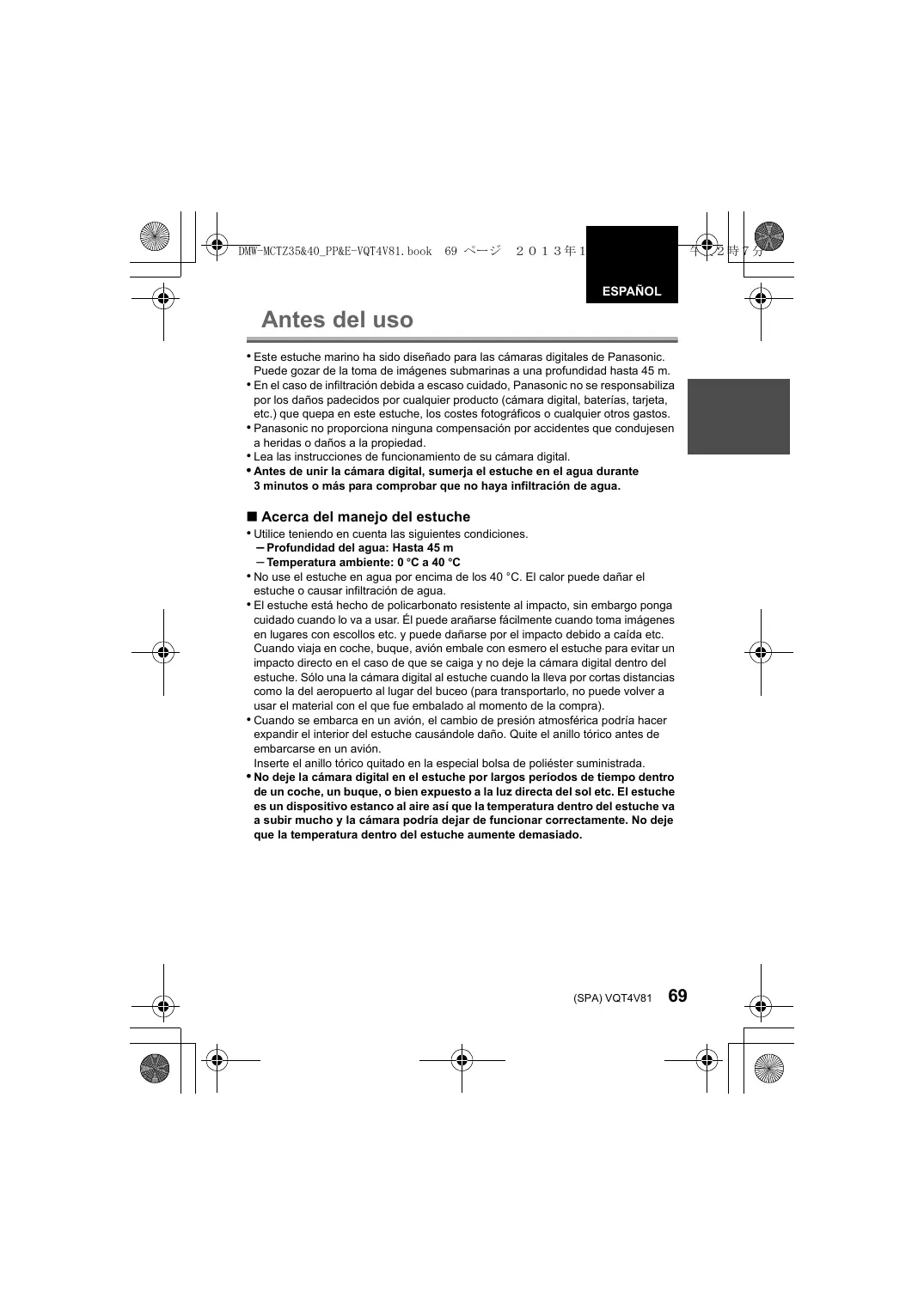 - Instrucciones de funcionamiento CARCASA SUBMARINA Gracias por comprar un producto Panasonic. Lea cuidadosamente estas instrucciones antes de usar este producto, y guarde este manual para usarlo en el futuro. Preparación ¿Qué es el anillo tórico? p. 73