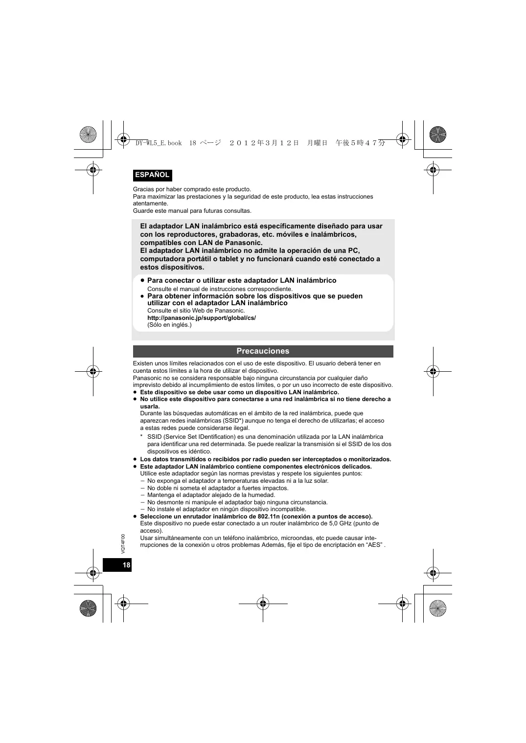 ESPAÑOL Gracias por haber comprado este producto. Para maximizar las prestaciones y la seguridad de este producto, lea estas instrucciones atentamente. Guarde este manual para futuras consultas. El adaptador LAN inalámbrico está específicamente diseñado para usar con los reproductores, grabadoras, etc. móviles e inalámbricos, compatibles con LAN de Panasonic. El adaptador LAN inalámbrico no admite la operación de una PC, computadora portátil o tablet y no funcionará cuando esté conectado a estos dispositivos. ≥ Para conectar o utilizar este adaptador LAN inalámbrico Consulte el manual de instrucciones correspondiente. ≥ Para obtener información sobre los dispositivos que se pueden utilizar con el adaptador LAN inalámbrico Consulte el sitio Web de Panasonic. http://panasonic.jp/support/global/cs/ (Sólo en inglés.) VQT4F00 Precauciones