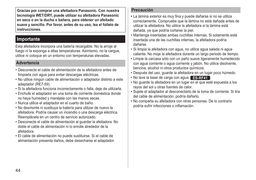 - Debido a que éste es un modelo recargable, no puede utilizarse mientras está conectado a la toma de corriente doméstica. Utilizar con el adaptador desconectado tras la carga completa. Servicio Para protección ambiental y reciclaje de materiales Contacto Visite el sitio Web de Panasonic, http://panasonic.net, o póngase en contacto con un centro de servicios autorizado (la dirección de contacto está en el folleto de garantía paneuropea) si necesita información o si la afeitadora o el cable de alimentación resultan dañados. Piezas de repuesto Las piezas de repuesto están disponibles en su distribuidor o en el Centro de Servicio. Lámina exterior y cuchillas internas del Partes de repuesto para sistema el modelo ES-RF41/ Lámina exterior del ES‑RF31 sistema Cuchillas internas Aceite