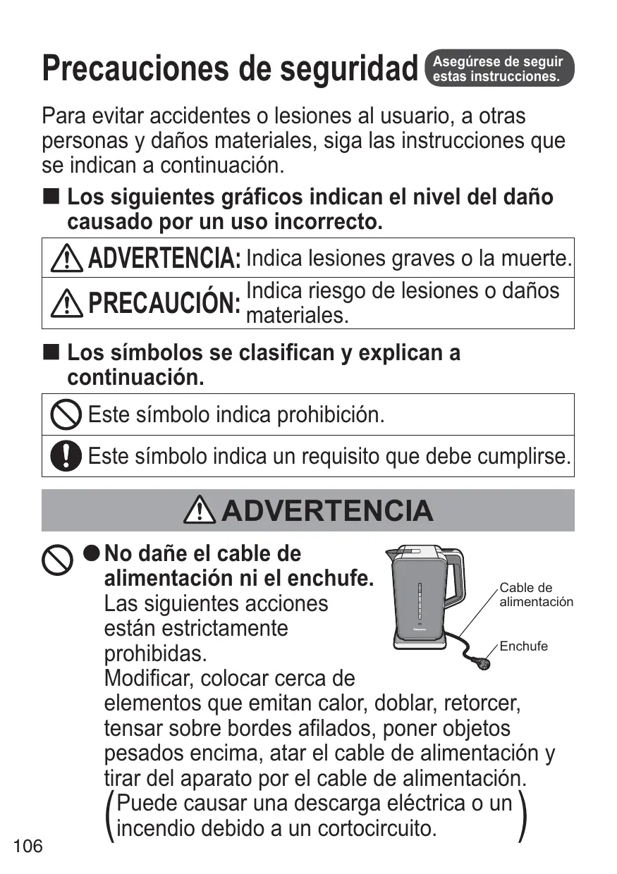 Precauciones de seguridad Asegúrese de seguir estas instrucciones. PRECAUCIÓN No utilice el aparato para ningún fin distinto de los descritos en estas instrucciones. (Puede causar una quemadura o lesiones.) ● Panasonic no acepta ninguna responsabilidad si se hace un uso indebido del aparato o si no se cumplen estas instrucciones. No toque las partes calientes (pitorro, etc.) durante o después del uso. (Puede causar una quemadura.) No vierta agua caliente ni mueva el aparato mientras el agua esté hirviendo. Puede salpicarse agua caliente, que podría causar quemaduras.