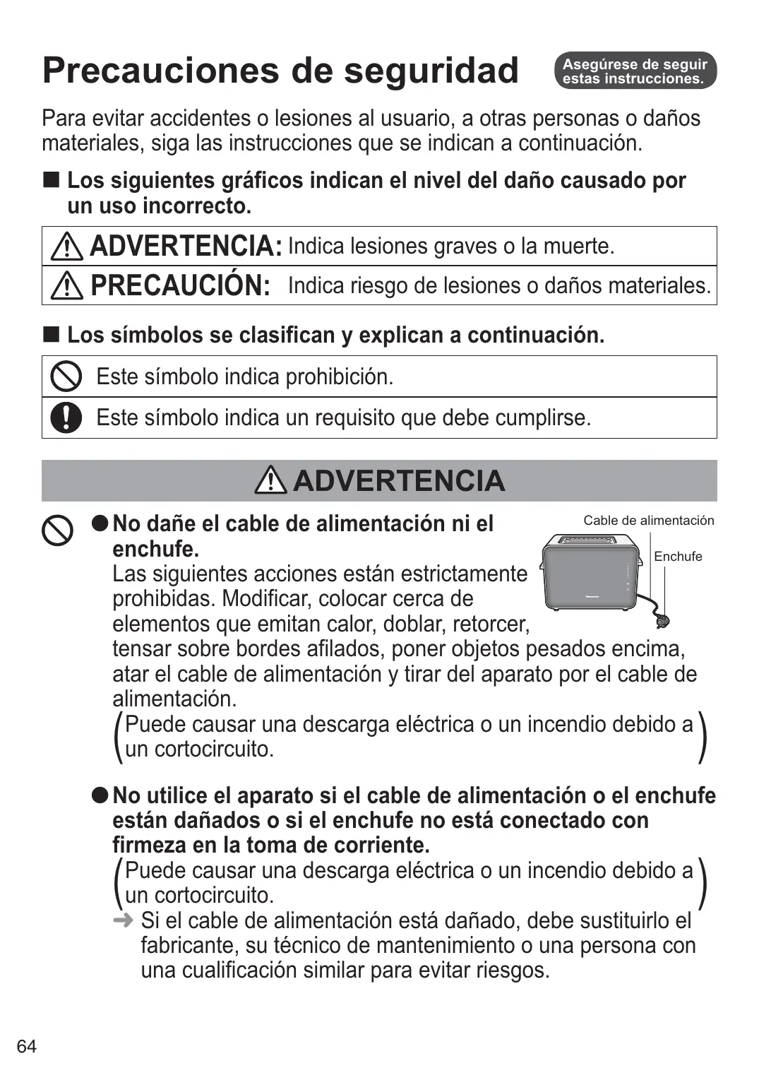 Precauciones de seguridad Asegúrese de seguir estas instrucciones. Para evitar accidentes o lesiones al usuario, a otras personas o daños materiales, siga las instrucciones que se indican a continuación. Los siguientes gráficos indican el nivel del daño causado por un uso incorrecto. ADVERTENCIA: Indica lesiones graves o la muerte. PRECAUCIÓN: Indica riesgo de lesiones o daños materiales. Los símbolos se clasifican y explican a continuación. Este símbolo indica prohibición. Este símbolo indica un requisito que debe cumplirse. ADVERTENCIA No dañe el cable de alimentación ni el Cable de alimentación enchufe. Enchufe Las siguientes acciones están estrictamente prohibidas. Modificar, colocar cerca de elementos que emitan calor, doblar, retorcer, tensar sobre bordes afilados, poner objetos pesados encima, atar el cable de alimentación y tirar del aparato por el cable de alimentación. Puede causar una descarga eléctrica o un incendio debido a un cortocircuito.
