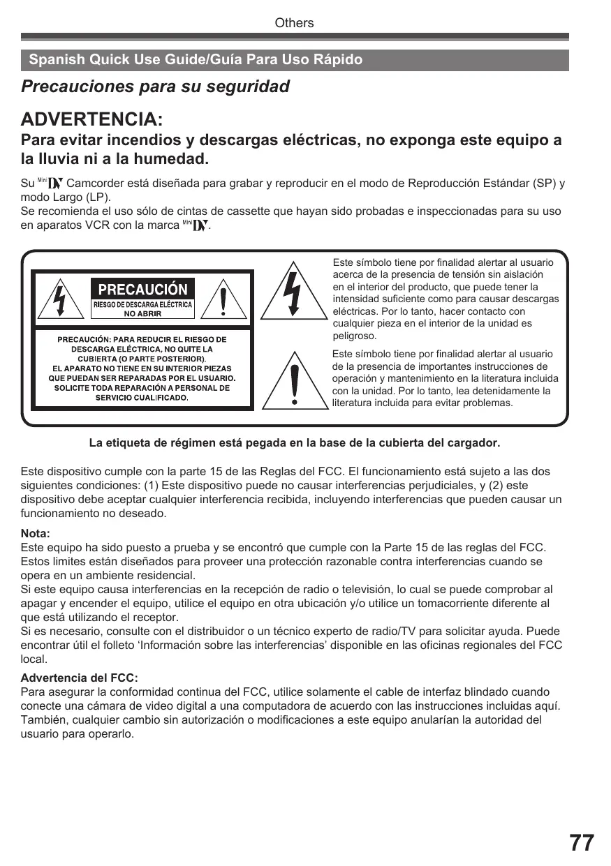 Para evitar incendios y descargas eléctricas, no exponga este equipo a la lluvia ni a la humedad. Su Camcorder está diseñada para grabar y reproducir en el modo de Reproducción Estándar (SP) y modo Largo (LP). Se recomienda el uso sólo de cintas de cassette que hayan sido probadas e inspeccionadas para su uso en aparatos VCR con la marca . Este símbolo tiene por finalidad alertar al usuario acerca de la presencia de tensión sin aislación en el interior del producto, que puede tener la intensidad suficiente como para causar descargas eléctricas. Por lo tanto, hacer contacto con cualquier pieza en el interior de la unidad es peligroso. Este símbolo tiene por finalidad alertar al usuario de la presencia de importantes instrucciones de operación y mantenimiento en la literatura incluida con la unidad. Por lo tanto, lea detenidamente la literatura incluida para evitar problemas.