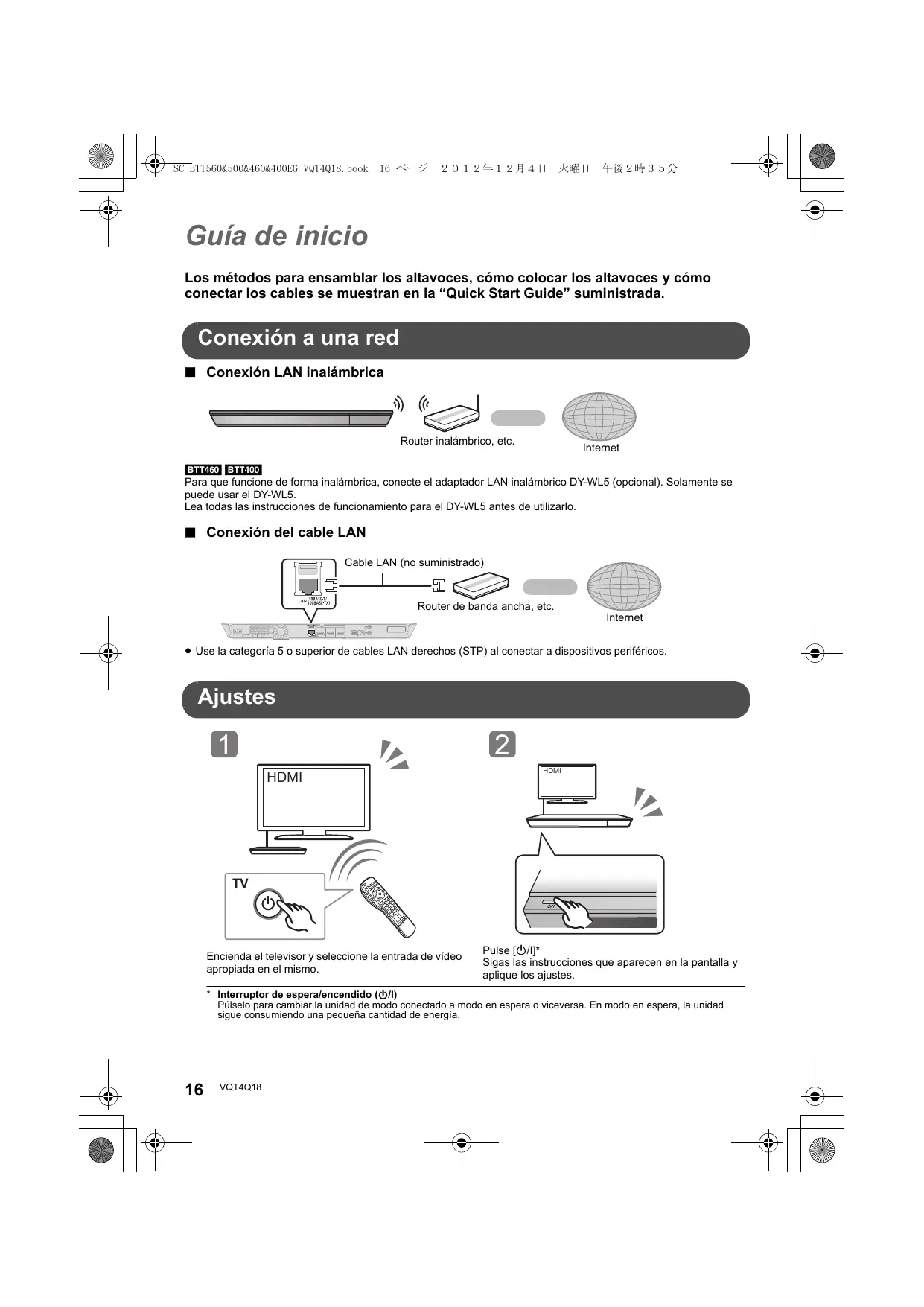 Guía de inicio Los métodos para ensamblar los altavoces, cómo colocar los altavoces y cómo conectar los cables se muestran en la “Quick Start Guide” suministrada. Conexión a una red ∫ Conexión LAN inalámbrica [BTT460] [BTT400] Para que funcione de forma inalámbrica, conecte el adaptador LAN inalámbrico DY-WL5 (opcional). Solamente se puede usar el DY-WL5. Lea todas las instrucciones de funcionamiento para el DY-WL5 antes de utilizarlo. ∫ Conexión del cable LAN Cable LAN (no suministrado) Router de banda ancha, etc. Internet ≥ Use la categoría 5 o superior de cables LAN derechos (STP) al conectar a dispositivos periféricos. Ajustes