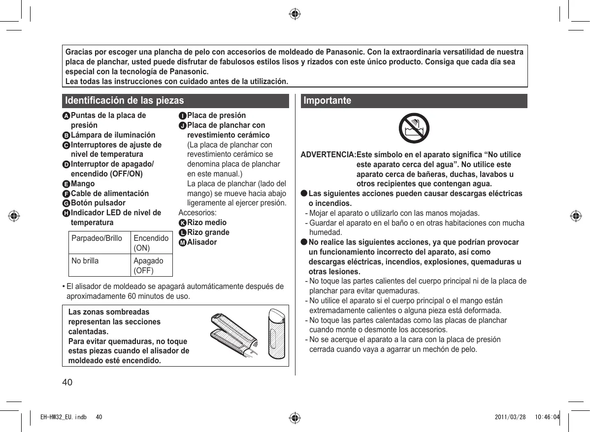 Gracias por escoger una plancha deleo con accesos de moldeado de Panasonic. Con laextraordinaria versitatldad de nuestra placade planchar,usted puee disfurar de fabulosos estilos lis y rizados con este unico producto.Consiga que cada dia sea especial con la technologia de Panasonic.