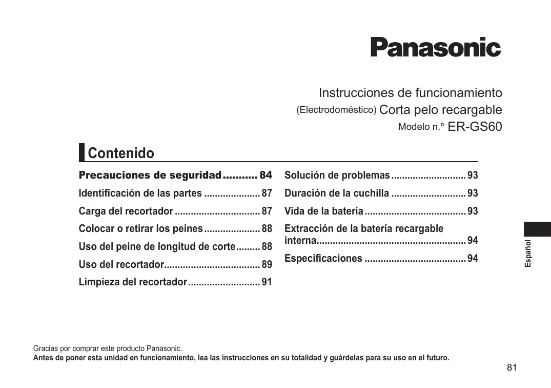 (Electrodoméstico) Corta pelo recargable Modelo n.º ER‑GS60 Precauciones de seguridad 84