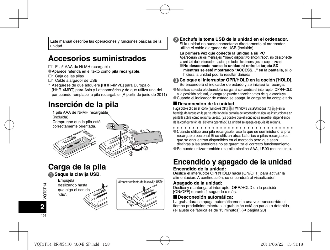 VQT3T14 *Cuando utilice una pila recargable, use la que se suministra o la pila recargable opcional Si se utilizan otras baterías o pilas recargables que se encuentran disponibles en el mercado pero que sean distintas a las anteriores no se garantiza el correcto funcionamiento. *Se puede utilizar también una pila alcalina AAA, LR03 (no incluida). Encendido y apagado de la unidad Encendido de la unidad: Deslice el interruptor OPR/HOLD hacia [ON/OFF] para activar la alimentación. A continuación, se encenderá el visualizador. 3 Coloque el interruptor OPR/HOLD en la opción [HOLD]. Se encenderá el indicador de estado y se iniciará la recarga. *Mientras se está efectuando la carga, si se cambia el interruptor OPR/HOLD a la posición original, la carga se puede cancelar antes de que concluya. *Cuando el indicador de estado se apaga, la carga se ha completado. g Desconexión de la unidad Carga de la pila Empújela deslizando hasta que oiga el sonido “clic”. Si la unidad no puede conectarse directamente al ordenador, utilice el cable alargador de USB (incluido). La primera vez que conecte la unidad a su PC Aparecerán varios mensajes “Nuevo dispositivo encontrado”, no desconecte la unidad del ordenador hasta que todos los mensajes desaparezcan. *No desconecte nunca la unidad ni retire la tarjeta SD mientras se esté mostrando “ACCESS…” en la pantalla, si lo hiciera la unidad podría resultar dañada. Haga doble clic en el icono (Windows XP: [ ], Windows Vista/Windows 7: [ ]) en la bandeja de tareas en la parte inferior de la pantalla del ordenador y siga las instrucciones en pantalla sobre cómo retirar la unidad. (Es posible que el icono no se muestre, dependiendo de la configuración del sistema operativo.) La unidad se apaga después de retirarla. 1 pila AAA de Ni-MH recargable (incluida) Compruebe que la pila esté correctamente orientada.