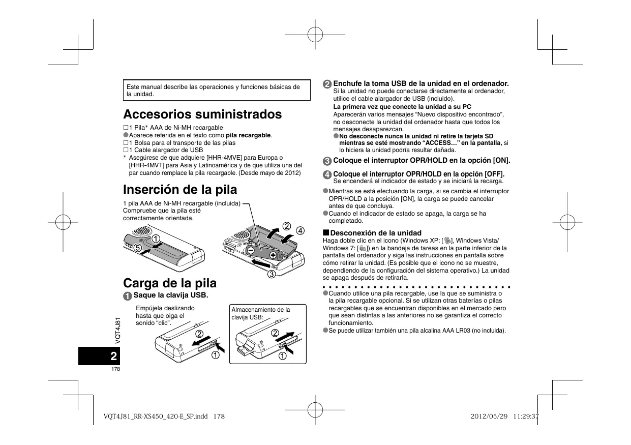 Este manual describe las operaciones y funciones básicas de la unidad. Accesorios suministrados 1 Pila AAA de Ni-MH recargable *Aparece referida en el texto como pila recargable. 1 Bolsa para el transporte de las pilas 1 Cable alargador de USB Asegúrese de que adquiere [HHR-4MVE] para Europa o [HHR-4MVT] para Asia y Latinoamérica y de que utiliza una del par cuando remplace la pila recargable. (Desde mayo de 2012) Inserción de la pila 1 pila AAA de Ni-MH recargable (incluida) Compruebe que la pila esté correctamente orientada. 2 Enchufe la toma USB de la unidad en el ordenador. Si la unidad no puede conectarse directamente al ordenador, utilice el cable alargador de USB (incluido). La primera vez que conecte la unidad a su PC Aparecerán varios mensajes “Nuevo dispositivo encontrado”, no desconecte la unidad del ordenador hasta que todos los mensajes desaparezcan. *No desconecte nunca la unidad ni retire la tarjeta SD mientras se esté mostrando “ACCESS…” en la pantalla, si lo hiciera la unidad podría resultar dañada. 3 Coloque el interruptor OPR/HOLD en la opción [ON]. 4 Coloque el interruptor OPR/HOLD en la opción [OFF]. Se encenderá el indicador de estado y se iniciará la recarga. *Mientras se está efectuando la carga, si se cambia el interruptor OPR/HOLD a la posición [ON], la carga se puede cancelar antes de que concluya. *Cuando el indicador de estado se apaga, la carga se ha completado. g Desconexión de la unidad Haga doble clic en el icono (Windows XP: [ ], Windows Vista/ Windows 7: [ ]) en la bandeja de tareas en la parte inferior de la pantalla del ordenador y siga las instrucciones en pantalla sobre cómo retirar la unidad. (Es posible que el icono no se muestre, dependiendo de la configuración del sistema operativo.) La unidad se apaga después de retirarla. 1 Saque la clavija USB. Empújela deslizando hasta que oiga el sonido “clic”. Almacenamiento de la clavija USB: *Cuando utilice una pila recargable, use la que se suministra o la pila recargable opcional. Si se utilizan otras baterías o pilas recargables que se encuentran disponibles en el mercado pero que sean distintas a las anteriores no se garantiza el correcto funcionamiento. *Se puede utilizar también una pila alcalina AAA LR03 (no incluida).