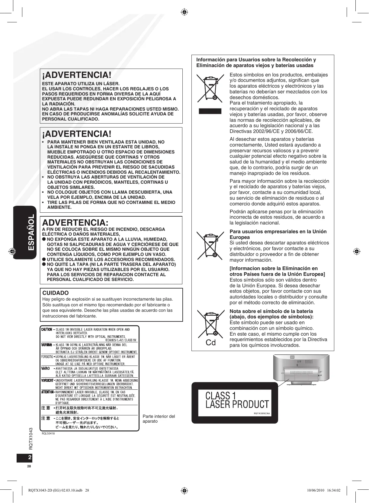 - NO QUITE LA TAPA (NI LA PARTE TRASERA DEL APARATO) YA QUE NO HAY PIEZAS UTILIZABLES POR EL USUARIO. PARA LOS SERVICIOS DE REPARACION CONTACTE AL PERSONAL CUALIFICADO DE SERVICIO. CUIDADO Hay peligro de explosión si se sustituyen incorrectamente las pilas. Sólo sustituya con el mismo tipo recomendado por el fabricante o que sea equivalente. Deseche las pilas usadas de acuerdo con las instrucciones del fabricante. RQTX1043 Estos símbolos en los productos, embalajes y/o documentos adjuntos, significan que los aparatos eléctricos y electrónicos y las baterías no deberían ser mezclados con los desechos domésticos. Para el tratamiento apropiado, la recuperación y el reciclado de aparatos viejos y baterías usadas, por favor, observe las normas de recolección aplicables, de acuerdo a su legislación nacional y a las Directivas 2002/96/CE y 2006/66/CE. Al desechar estos aparatos y baterías correctamente, Usted estará ayudando a preservar recursos valiosos y a prevenir cualquier potencial efecto negativo sobre la salud de la humanidad y el medio ambiente que, de lo contrario, podría surgir de un manejo inapropiado de los residuos. Para mayor información sobre la recolección y el reciclado de aparatos y baterías viejos, por favor, contacte a su comunidad local, su servicio de eliminación de residuos o al comercio donde adquirió estos aparatos. Podrán aplicarse penas por la eliminación incorrecta de estos residuos, de acuerdo a la legislación nacional. Para usuarios empresariales en la Unión Europea Si usted desea descartar aparatos eléctricos y electrónicos, por favor contacte a su distribuidor o proveedor a fin de obtener mayor información. [Informacion sobre la Eliminación en otros Países fuera de la Unión Europea] Estos símbolos sólo son válidos dentro de la Unión Europea. Si desea desechar estos objetos, por favor contacte con sus autoridades locales o distribuidor y consulte por el método correcto de eliminación. Nota sobre el símbolo de la bateria (abajo, dos ejemplos de símbolos): Este símbolo puede ser usado en combinación con un símbolo químico. En este caso, el mismo cumple con los requerimientos establecidos por la Directiva para los químicos involucrados. RQT4389ZAA RQLS0418