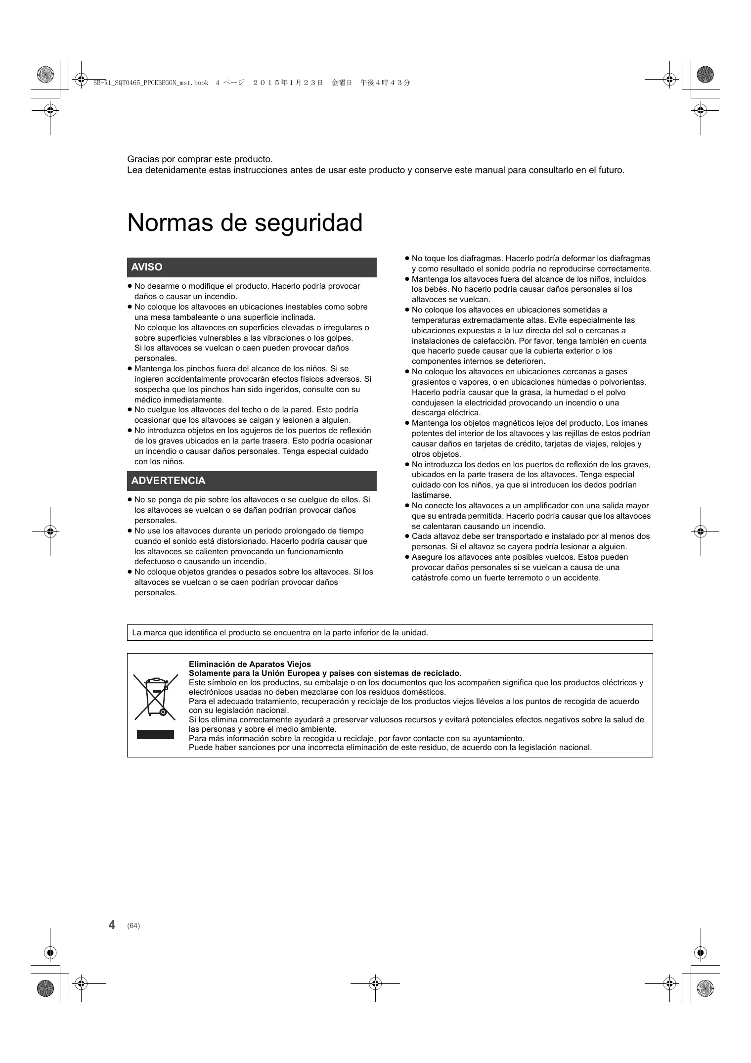 Instrucciones de funcionamiento Cajas acústicas Betjeningsvejledning Højttalersystem Gebruiksaanwijzing Luidsprekersysteem Bruksanvisning Högtalarsystem Käyttöohjeet Kaiutinjärjestelmä SB-R1 Gracias por comprar este producto. Lea detenidamente estas instrucciones antes de usar este producto y conserve este manual para consultarlo en el futuro. Normas de seguridad AVISO ≥ No desarme o modifique el producto. Hacerlo podría provocar daños o causar un incendio. ≥ No coloque los altavoces en ubicaciones inestables como sobre una mesa tambaleante o una superficie inclinada. No coloque los altavoces en superficies elevadas o irregulares o sobre superficies vulnerables a las vibraciones o los golpes. Si los altavoces se vuelcan o caen pueden provocar daños personales. ≥ Mantenga los pinchos fuera del alcance de los niños. Si se ingieren accidentalmente provocarán efectos físicos adversos. Si sospecha que los pinchos han sido ingeridos, consulte con su médico inmediatamente. ≥ No cuelgue los altavoces del techo o de la pared. Esto podría ocasionar que los altavoces se caigan y lesionen a alguien. ≥ No introduzca objetos en los agujeros de los puertos de reflexión de los graves ubicados en la parte trasera. Esto podría ocasionar un incendio o causar daños personales. Tenga especial cuidado con los niños. ADVERTENCIA ≥ No se ponga de pie sobre los altavoces o se cuelgue de ellos. Si los altavoces se vuelcan o se dañan podrían provocar daños personales. ≥ No use los altavoces durante un periodo prolongado de tiempo cuando el sonido está distorsionado. Hacerlo podría causar que los altavoces se calienten provocando un funcionamiento defectuoso o causando un incendio. ≥ No coloque objetos grandes o pesados sobre los altavoces. Si los altavoces se vuelcan o se caen podrían provocar daños personales. ≥ No toque los diafragmas. Hacerlo podría deformar los diafragmas y como resultado el sonido podría no reproducirse correctamente. ≥ Mantenga los altavoces fuera del alcance de los niños, incluidos los bebés. No hacerlo podría causar daños personales si los altavoces se vuelcan. ≥ No coloque los altavoces en ubicaciones sometidas a temperaturas extremadamente altas. Evite especialmente las ubicaciones expuestas a la luz directa del sol o cercanas a instalaciones de calefacción. Por favor, tenga también en cuenta que hacerlo puede causar que la cubierta exterior o los componentes internos se deterioren. ≥ No coloque los altavoces en ubicaciones cercanas a gases grasientos o vapores, o en ubicaciones húmedas o polvorientas. Hacerlo podría causar que la grasa, la humedad o el polvo condujesen la electricidad provocando un incendio o una descarga eléctrica. ≥ Mantenga los objetos magnéticos lejos del producto. Los imanes potentes del interior de los altavoces y las rejillas de estos podrían causar daños en tarjetas de crédito, tarjetas de viajes, relojes y otros objetos. ≥ No introduzca los dedos en los puertos de reflexión de los graves, ubicados en la parte trasera de los altavoces. Tenga especial cuidado con los niños, ya que si introducen los dedos podrían lastimarse. ≥ No conecte los altavoces a un amplificador con una salida mayor que su entrada permitida. Hacerlo podría causar que los altavoces se calentaran causando un incendio. ≥ Cada altavoz debe ser transportado e instalado por al menos dos personas. Si el altavoz se cayera podría lesionar a alguien. ≥ Asegure los altavoces ante posibles vuelcos. Estos pueden provocar daños personales si se vuelcan a causa de una catástrofe como un fuerte terremoto o un accidente. La marca que identifica el producto se encuentra en la parte inferior de la unidad. Eliminación de Aparatos Viejos Solamente para la Unión Europea y países con sistemas de reciclado. Este símbolo en los productos, su embalaje o en los documentos que los acompañen significa que los productos eléctricos y electrónicos usadas no deben mezclarse con los residuos domésticos. Para el adecuado tratamiento, recuperación y reciclaje de los productos viejos llévelos a los puntos de recogida de acuerdo con su legislación nacional. Si los elimina correctamente ayudará a preservar valuosos recursos y evitará potenciales efectos negativos sobre la salud de las personas y sobre el medio ambiente. Para más información sobre la recogida u reciclaje, por favor contacte con su ayuntamiento. Puede haber sanciones por una incorrecta eliminación de este residuo, de acuerdo con la legislación nacional.