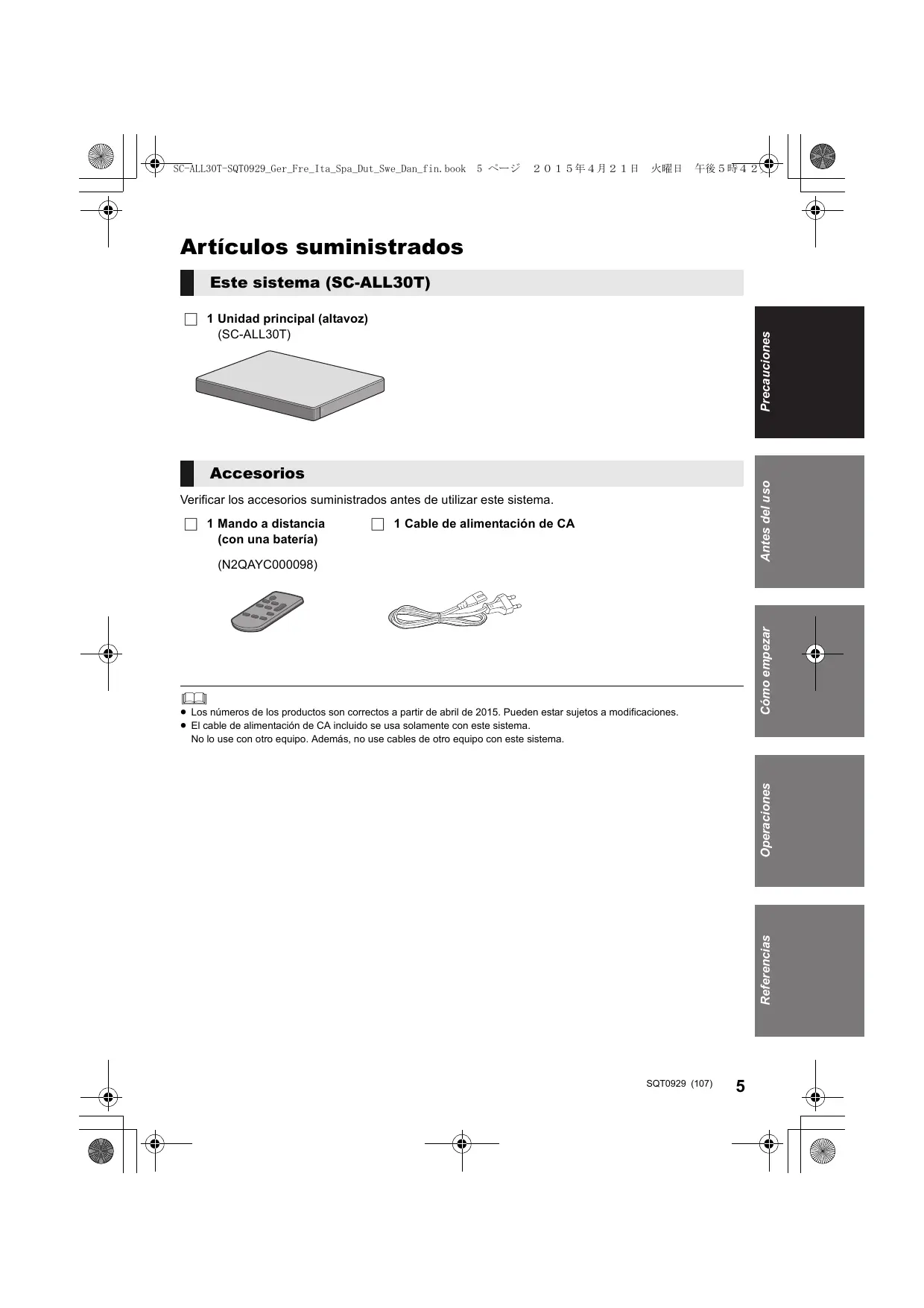 Precauciones Precauciones de seguridad Índice Precauciones de seguridad ............................................................................. 3 Accesorios Verificar los accesorios suministrados antes de utilizar este sistema. ∏ 1 Mando a distancia (con una batería) ∏ 1 Cable de alimentación de CA Cómo empezar (N2QAYC000098) Referencias Operaciones ≥ Los números de los productos son correctos a partir de abril de 2015. Pueden estar sujetos a modificaciones. ≥ El cable de alimentación de CA incluido se usa solamente con este sistema. No lo use con otro equipo. Además, no use cables de otro equipo con este sistema. SQT0929 (107)