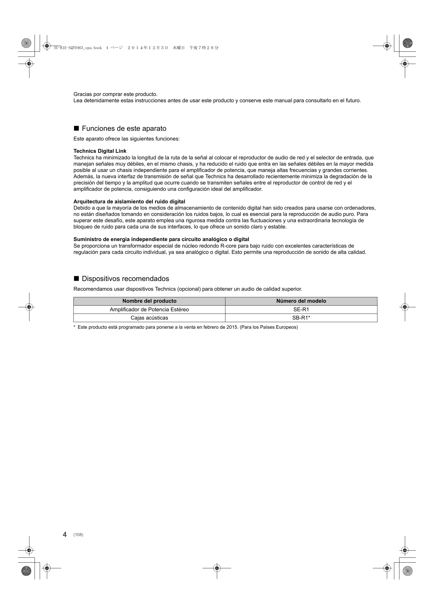 Instrucciones de funcionamiento Reproductor Audio en Red con Pre-amplificador Betjeningsvejledning Netværkslydkontrolafspiller Gebruiksaanwijzing ≥ “Program Clear” s’affiche. Gracias por comprar este producto. Lea detenidamente estas instrucciones antes de usar este producto y conserve este manual para consultarlo en el futuro. ∫ Funciones de este aparato Este aparato ofrece las siguientes funciones: Technics Digital Link Technics ha minimizado la longitud de la ruta de la señal al colocar el reproductor de audio de red y el selector de entrada, que manejan señales muy débiles, en el mismo chasis, y ha reducido el ruido que entra en las señales débiles en la mayor medida posible al usar un chasis independiente para el amplificador de potencia, que maneja altas frecuencias y grandes corrientes. Además, la nueva interfaz de transmisión de señal que Technics ha desarrollado recientemente minimiza la degradación de la precisión del tiempo y la amplitud que ocurre cuando se transmiten señales entre el reproductor de control de red y el amplificador de potencia, consiguiendo una configuración ideal del amplificador. Arquitectura de aislamiento del ruido digital Debido a que la mayoría de los medios de almacenamiento de contenido digital han sido creados para usarse con ordenadores, no están diseñados tomando en consideración los ruidos bajos, lo cual es esencial para la reproducción de audio puro. Para superar este desafío, este aparato emplea una rigurosa medida contra las fluctuaciones y una extraordinaria tecnología de bloqueo de ruido para cada una de sus interfaces, lo que ofrece un sonido claro y estable. Suministro de energía independiente para circuito analógico o digital Se proporciona un transformador especial de núcleo redondo R-core para bajo ruido con excelentes características de regulación para cada circuito individual, ya sea analógico o digital. Esto permite una reproducción de sonido de alta calidad. ∫ Dispositivos recomendados Recomendamos usar dispositivos Technics (opcional) para obtener un audio de calidad superior. Nombre del producto Número del modelo Amplificador de Potencia Estéreo SE-R1 Cajas acústicas SB-R1*