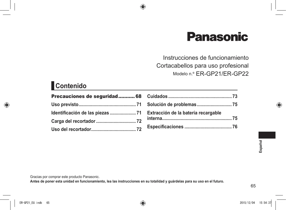 Descarga las instrucciones para tu Cortapelos en formato PDF gratis! Encuentra tus instrucciones ER-GP21 - PANASONIC y toma tu dispositivo electrónico nuevamente en la mano. En esta página están publicados todos los documentos necesarios para el uso de su dispositivo. ER-GP21 de la marca PANASONIC.