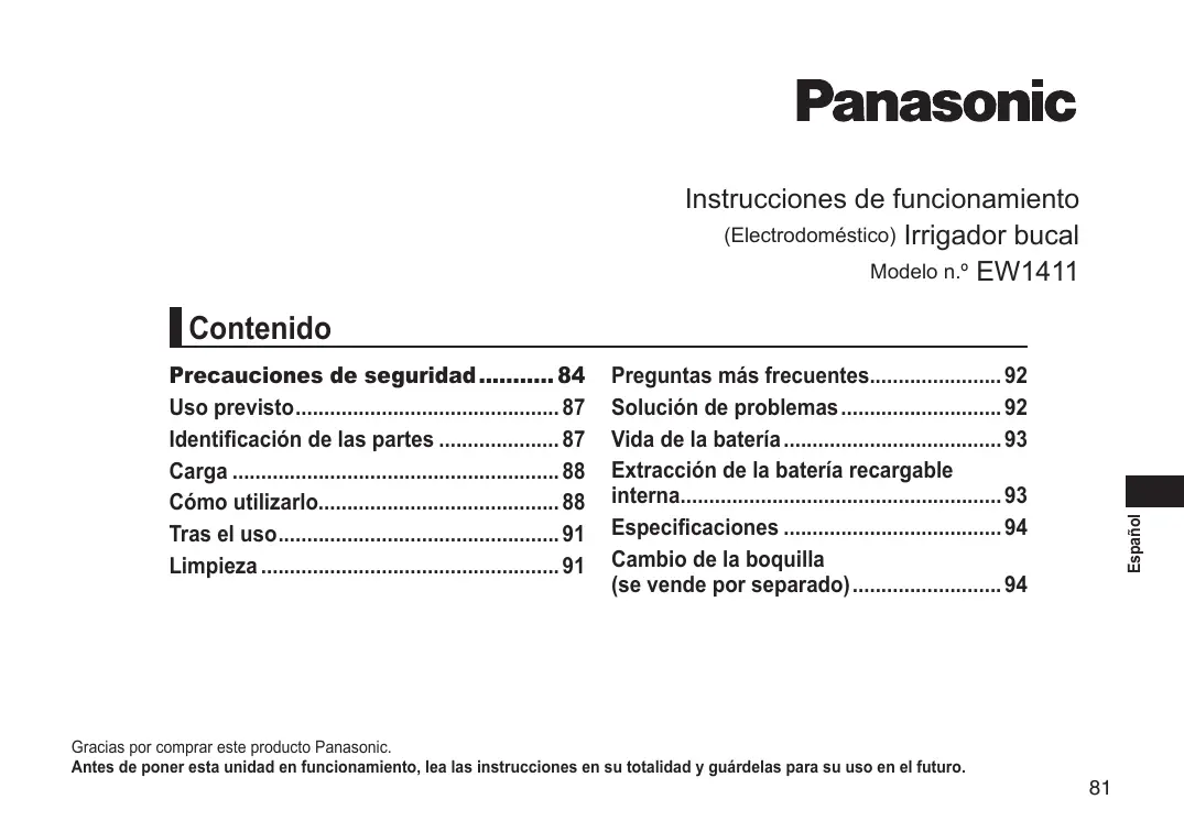 - Gracias por comprar este producto Panasonic. Antes de poner esta unidad en funcionamiento, lea las instrucciones en su totalidad y guárdelas para su uso en el futuro. Español Precauciones de seguridad p. 84