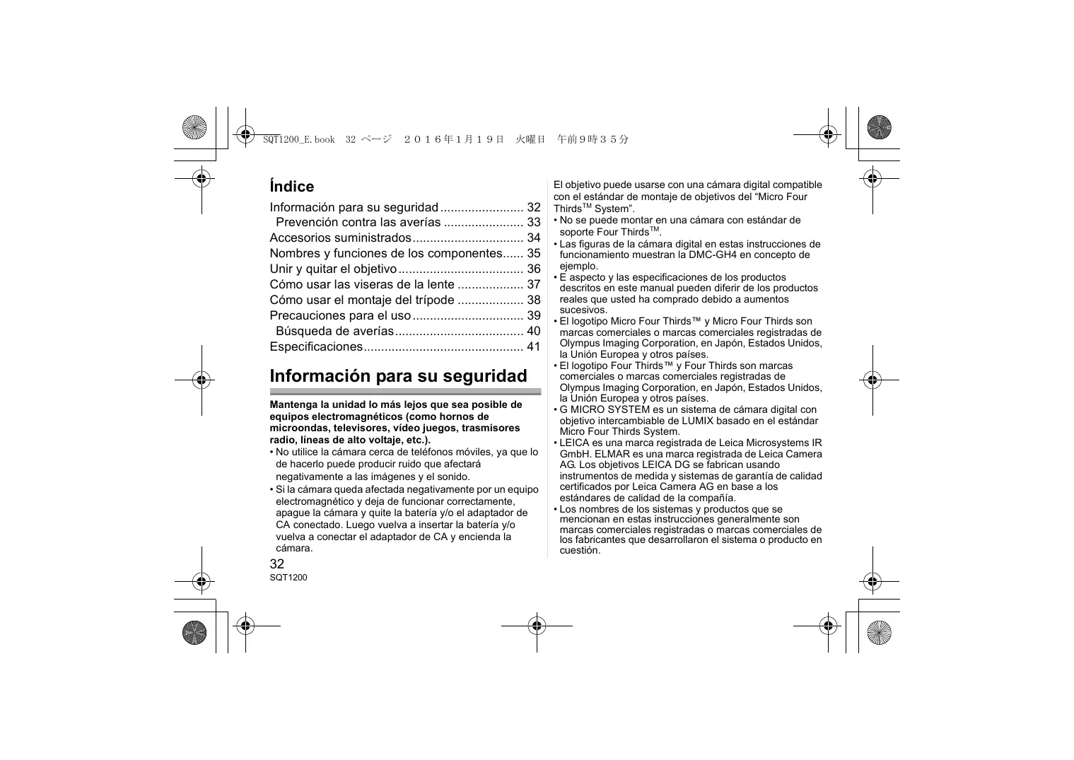 Índice Información para su seguridad 32 Prevención contra las averías 33 Accesorios suministrados 34 Nombres y funciones de los componentes 35 Unir y quitar el objetivo 36 Cómo usar las viseras de la lente 37 Cómo usar el montaje del trípode 38 Precauciones para el uso 39 Búsqueda de averías 40 Especificaciones 41